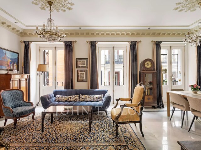 John Taylor presents this spectacular corner property, located in an imposing building with a classic facade in the vibrant neighborhood of Justica. A spectacular property that undoubtedly stands out for its nine balconies and its impressive 3.50 meter high ceilings. The social area occupies the entire corner of the house, with five balconies in total, and includes two living areas, dining area and open kitchen, fully equipped and with a large central island. In this area there is also a nice office. There is a guest toilet and laundry room. The night area includes three bedrooms and three bathrooms, all exterior with balcony and two of them with bathroom en suite. The heating is underfloor heating, the AC by ducts and hot water by aerothermal. Without any doubt an exceptional property in the most fashionable area of the city.