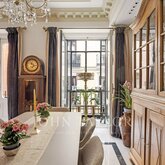 Just steps away from Le Bon Marché, hidden from view at the end of a charming paved and flower-filled courtyard, we present a stunning property dating back to the early 18th century. It comprises a main house with a floor area of 267.39 m² (234.30 m² under the Carrez law) surrounded by two lush gardens with terraces totaling 601 m² (300 m² on each side, exclusively for private use, non-buildable), as well as a 33.22 m² guest house (32.72 m² under the Carrez law). ###The Main House Built over three levels, the main house is laid out as follows: **Ground floor:** - An entrance hall - A dining room - A 33 m² living room opening onto both gardens and terraces - A 20 m² sitting room opening onto the second garden and a terrace - A bathroom with toilet - A guest powder room - A kitchen - A laundry room **First floor:** - A spacious, cross-lit "cathedral" master suite with a bathroom, dressing room, and access to a mezzanine - Two additional bedrooms, each with its own bathroom/shower room and toilet, plus an ironing/storage room **Second floor:** - A cross-lit study with stunning views of both gardens (can be converted into a bedroom) - A bathroom with toilet - A dressing room and attic storage under the eaves, as well as a mezzanine ### The Guest House Recently renovated, the guest house, discreetly located at the back of the second garden, features: - An entrance hall - A bedroom - A bathroom with toilet - A study ### Additional Features - Three beautiful historic cellars and a parking space complete this property. Its prime location, expansive outdoor spaces, tranquility, and unique charm make this property one-of-a-kind in Paris.