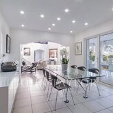 Located in the urbanization with 24h security in Can furnet less than 5 minutes from Ibiza and Marina botafoch, we find this house located on two plots. The plot has 1.428 m2 with 835 m2 in the main house and xxm2 in the guest house. The whole house overlooks Ibiza and the Mediterranean Sea, with a very Mediterranean architecture and its plants in the swimming pool make this house unique in the area. In the main house there is a large living room with access to a dining room for 12 people and a dream kitchen. All these rooms border the terrace which gives access to the pool through all of them. If we go up to the upper floor we find 4 double bedrooms en suite and a second living room. On the terrace at the foot of the living room there is a barbecue area, seating for relaxing and large sunbeds for sunbathing. In the guest house there is a gymnasium and sauna accessible from the outside, plus a small office area and 3 double bedrooms. On the rooftop of the main house we have a spectacular outdoor area with a jacuzzi overlooking the urbanization, Ibiza and Formentera. The house also has a service area, and some extras that you will have to find out, if you visit it!