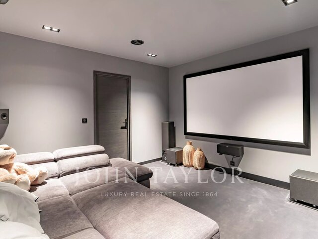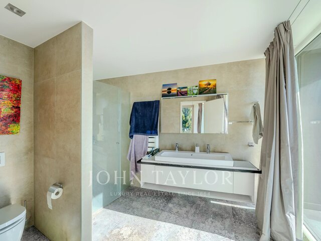 Gorgeous modern villa of 420 sqm built on an enclosed field of 2500 sqm with pool, in a private closed domain. At the ground floor : an entrance, a living room with fireplace, a study & tv lounge, a fitted kitchen, a laundry room, one bedroom with shower room. First floor : 2 en suite bedrooms with bathroom/shower room, a master bedroom with a large dressing and a shower room. The bedrooms are giving onto large terraces. Basement : a wine cellar, numerous storage areas, a separated bedroom with shower room. Garage, caretaker’s apartment and a guest house including 2 bedrooms and 2 shower rooms. Pool house.