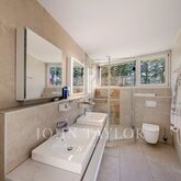 This spacious villa with wonderful sea views is located on an unusually large plot for the coveted Cas Catalá area and is a paradise especially for sports lovers and in general for a large family that enjoys outdoor activities. Apart from spacious terraces and a large heated pool, the property is completed with a tennis court that can also be used to practice other sports. The villa is spread over 3 floors. Through the slope of the plot, one enters the house through the middle floor, which offers a living area with several spaces: a living room, a cozy room with a fireplace to read or watch television, a spacious dining room, a large kitchen, an office, a laundry room, a bedroom, a bathroom and a garage for 2 cars. Outside conveniently near the kitchen and dining room is a porch with barbecue area. On the upper floor we find the master bedroom with dressing room and bathroom en suite. On this floor there are also 2 more bedrooms and access to several terraces with fabulous views of the sea and Palma. On the lower floor there is another living room, a small kitchen and 2 bedrooms with bathroom en suite. The spa and fitness area consists of a sauna, a Turkish bath, a bathroom and the gym with a variety of machines. This area connects perfectly with the terrace with jacuzzi and from there you can access the large garden with solarium, swimming pool and the multi-sports court. There is also an apartment for the staff there. Rarely does a house with these characteristics come on the market that is ideal for a large family or to receive and entertain many guests in a privileged location so close to Palma and everything that the Bendinat and Portals Nous area has to offer.