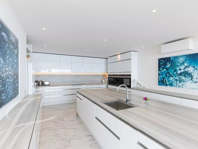 As it is located on an elevated plot in Son Vida this new built villa features empressive views over the golf course to the bay of Palma. The villa has three levels and offers an open plan kitchen with dining and lounge area, a spacious master suite, five more bedrooms and rooms for a gym and laundry area. The property has parking space and the garden area is planted with easy to care for plants. Son Vida – the epitome of luxury livestyle in Mallorca was first recorded in the 13th century. The castle which was mentioned is now a famous hotel. The site started out as a farming area and was developed by the Vida family. Nowadays it is a gated community with several golf courses, two five star hotels and and a vast array of stunning properties with amazing views over the surrounding mountains and the bay of Palma. It has attracted famous visitors and royals and has been the home of celebraties, golf and architecture lovers alike. It has an easy access to all amenties like cultural events, cinemas, shopping, sport and medical centres and it is only a stone´s throw away from the capital Palma. Famous beaches and their clubs are within a short drive and the aiport is just 15minutes away which also makes it attractive to commuters. Son Vida is divided into the newer and the older part. In the new Son Vida you will find stunning villas with purist and modern architecture and more the more classical Mediterranean style ones around the golf courses in the older part. So there is something for every taste in the selection of exclusive property in this unique enclave.