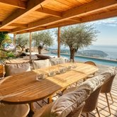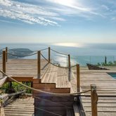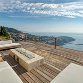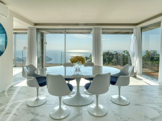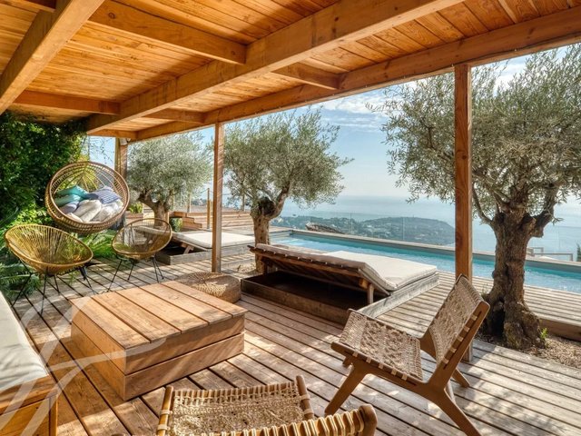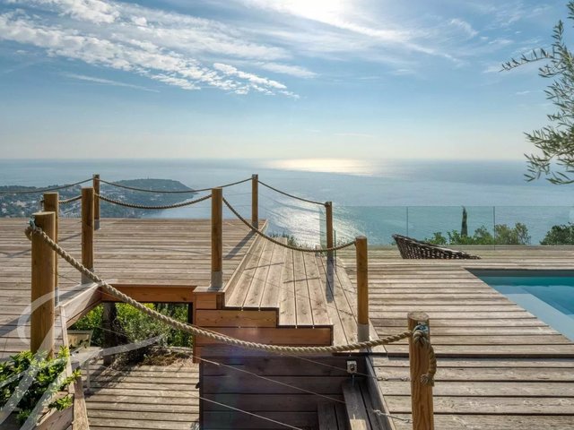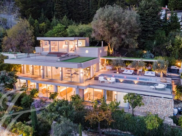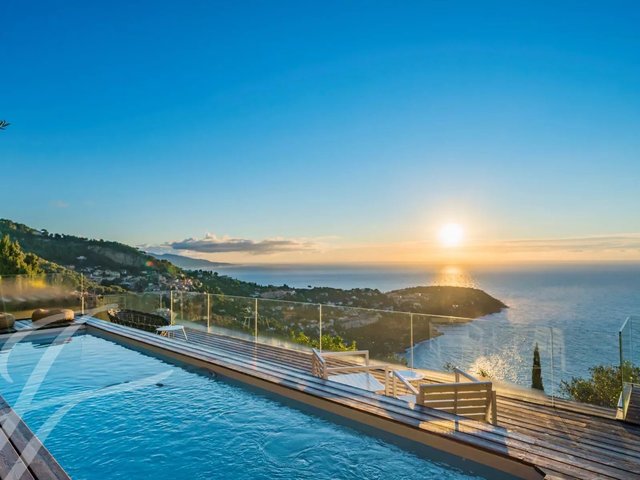 Roquebrune Cap Martin, luxurious contemporary villa of approximately 370 sqm offering an exceptional panoramic sea view. Enjoying a timeless living environment, this villa features spacious terraces including a beautiful pool area with pool house and summer lounge, an elevated terrace with a magical sea view, an outdoor dining area with the charm of Provence overlooking the sea. The main villa consists of: Entrance to a triple living room including a TV lounge with its fireplace (double-sided insert), a second lounge, a dining room, a high-end American kitchen fully equipped, all opening onto a sea view terrace. A mezzanine with a sea-view bedroom en suite. On the upper level, there is a very beautiful Master bedroom en suite with sea view, bathroom and dressing room, an office space opening onto a large terrace with an incredible sea view. On the lower level, there are three beautiful sea-view bedrooms, each with storage and a work area, a bathroom with bathtub and shower, as well as a shower room with sauna. An independent studio comprising a bedroom with its shower room and a workspace. The amenities of this property are of very high standard, with materials and finishes of great quality. Set on landscaped grounds adorned with Mediterranean species and fruit trees, the property benefits from a privileged location facing the sea. Close to Monaco and Italy, this property is an ideal setting for both primary and secondary residences. It also represents a high-potential rental investment opportunity. An outdoor parking space can accommodate three vehicles, with the possibility of creating enclosed garages.