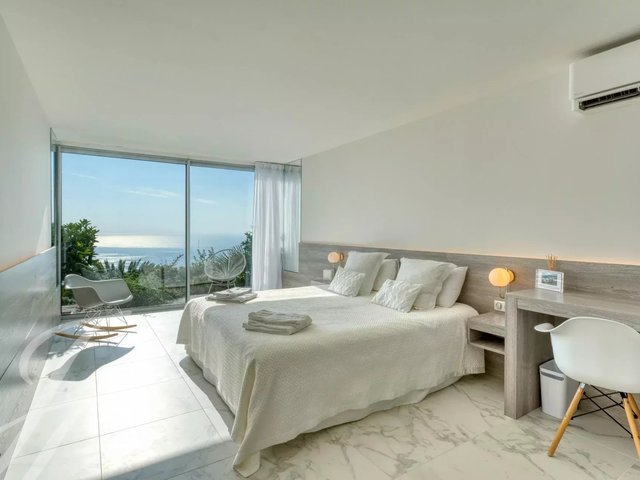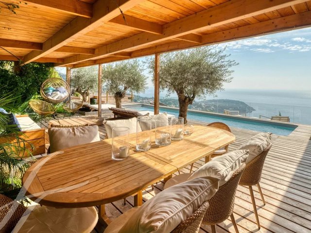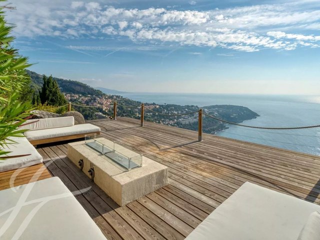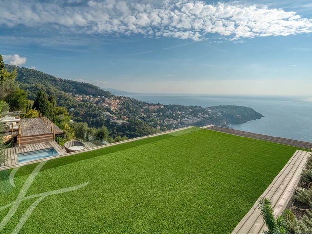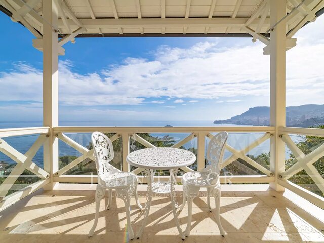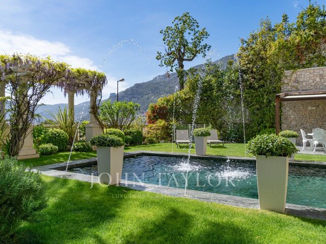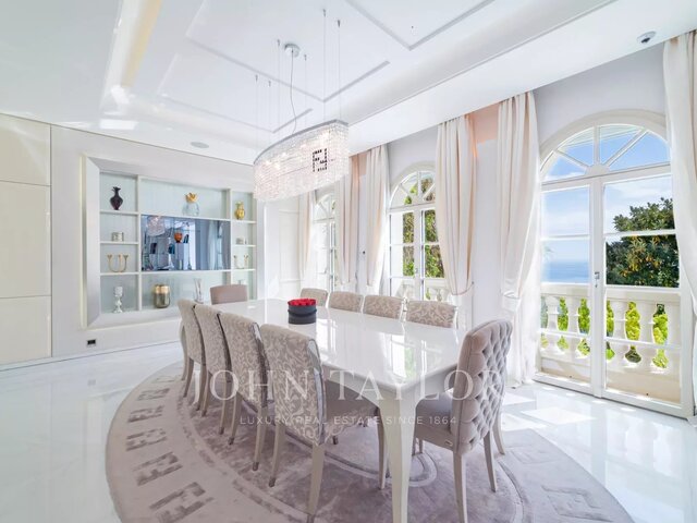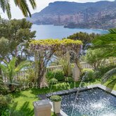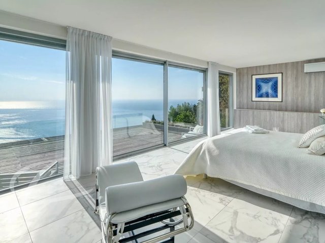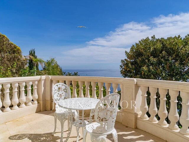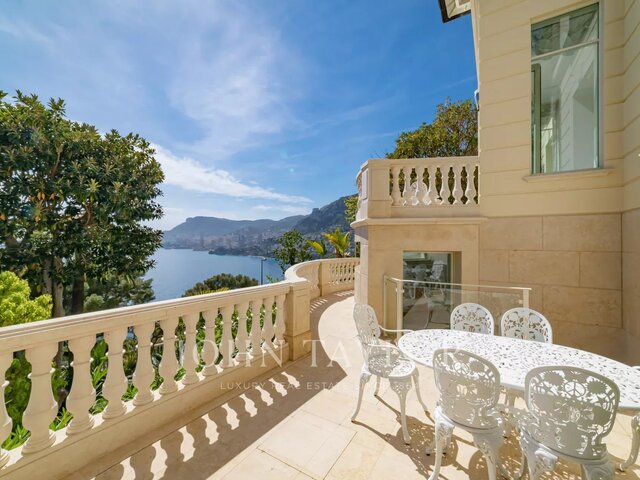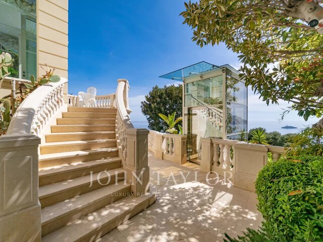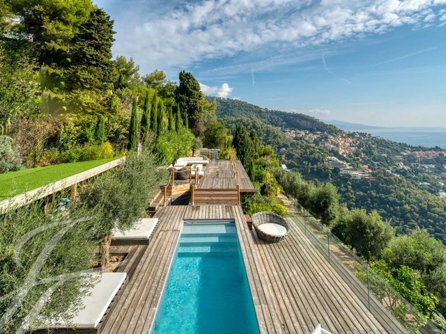 Five minutes from the Principality, an oasis of luxury with panoramic sea view overlooking the Mediterranean Sea and Monaco. This villa has been renovated with high-end materials including Fendi. It offers approximately 400sqm of living space on 800sqm of flat land. This exceptional property features a heated pool with waterfalls, landscaped gardens, and top-of-the-line amenities. A large garage that can accommodate multiple vehicles. Villa layout: On the ground floor: - Entrance/Library - Main living room - Dining room - Kitchen. First floor: - Master bedroom with 2 bathrooms - Walk-in closet - Two bedrooms each with a bathroom - Home theatre, music, and conference room - Home Cinema Second floor: - Guest room or office with bathroom Garden level: - Gym with relaxation area - Hammam - Staff bedroom with bathroom - Laundry room. - Wine cellar Pool House. External panoramic elevator. Internal elevator.