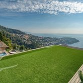 On the hills of La Colle-sur-Loup, in the most prestigious neighborhood of the Saint-Paul de Vence area, a majestic stone-built property of 800sq.m designed by a well known local architect benefits from magnificent sea and forest views on its massive landscaped grounds of approximately 1 hectare with its large heated infinity pool. A welcoming courtyard leads us to the property which comprises of an entrance hall, 3 sitting rooms, a dining room, a kitchen with pantry, a large well furnished covered terrace with bar, outside kitchen, TV area, 6 bedrooms and 5 bathrooms. On the lower floor, a relaxing wellness room with massage room, jacuzzi, sauna, hammam, a music room/dancing room, a cinema, a wine cellar and a 1-bedroom apartment. Completely independent and well integrated in the landscaped parc, a large gym with a reclining climbing wall, changing room and tennis court will enable the most sportive guests to use every aspect of the property ! Garages for 6 véhicules, numerous parking spots, 1-bedroom apartment for the caretaker and a studio/security room, technical and staff rooms.