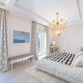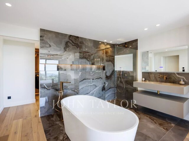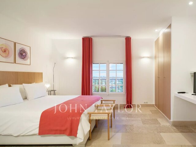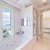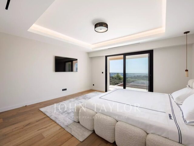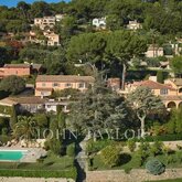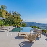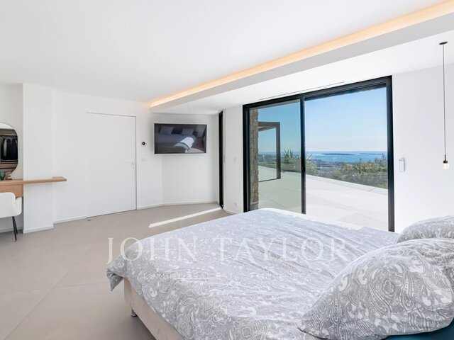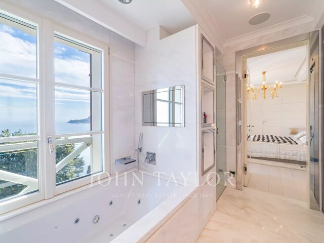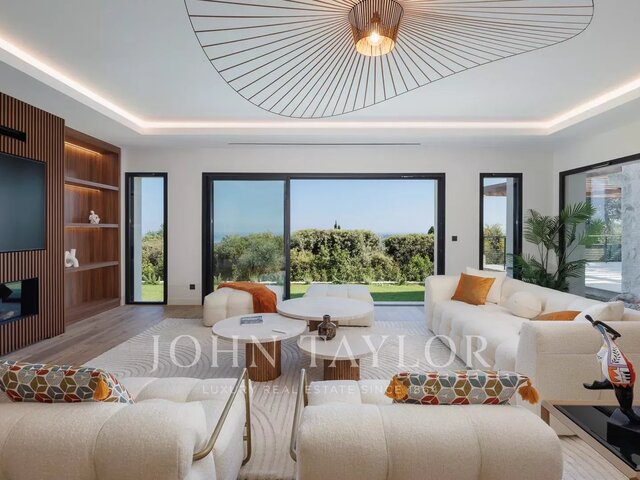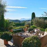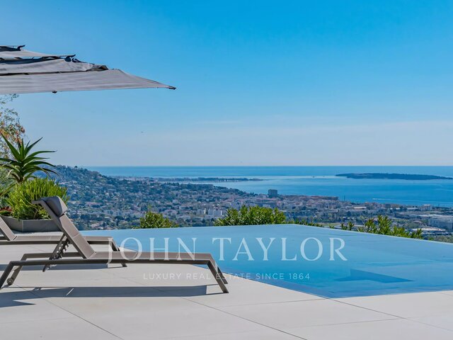 Co-exclusivity. Situated on the heights of Cannes' most coveted hill, this sumptuous property enjoys spectacular panoramic views over the bay, the Lérins islands and the Estérel massif. Completely renovated in a contemporary Provencal style, the property combines refined decor, soft colors and top-of-the-range amenities to create a natural ambience in an idyllic setting representing the art of living in Provence. The villa's interior and exterior design is dedicated to the comfort of its occupants. First floor: entrance, master suite opening onto south-facing terrace with sea view, dressing room, bathroom, shower and toilet; second bedroom opening onto terrace with sea view, shower room and toilet; third bedroom opening onto terrace with sea view, dressing room, bathroom, separate toilet. On the garden level: a vast living room with fireplace opening onto terrace, dining room opening onto terrace also leading onto covered terrace equipped with summer dining room and guest toilet, a beautiful kitchen with wine cellar opening onto terrace, a second fully equipped kitchen with laundry room, and a bedroom with shower room. Staff house of approx. 117 m² comprising a living room with kitchenette, three bedrooms, shower room and toilet. Carport and garage. An independent bedroom with shower room is located on the pool level. Set in beautifully structured landscaped grounds of approx. 7,700 m², the attractive pool area invites you to relax overlooking the Mediterranean Sea. It features a covered terrace equipped with a lounge and summer kitchen with bar, shower and toilet. The infinity pool, which can be heated, includes a Jacuzzi. A fitness room with "Star Trac" equipment also boasts a sea view.