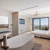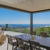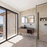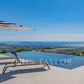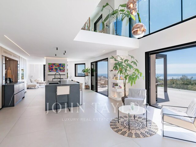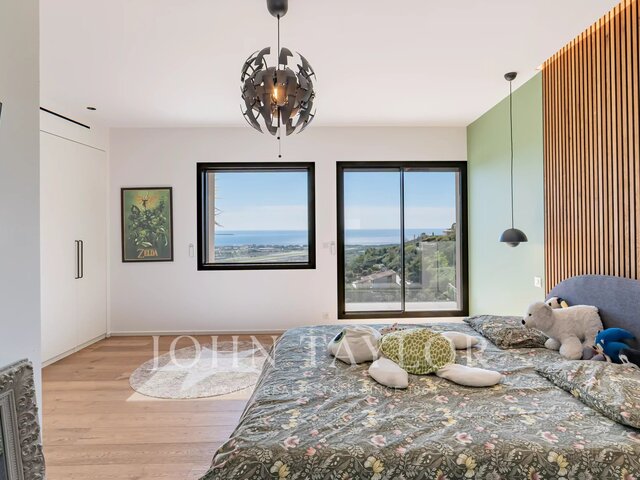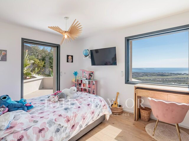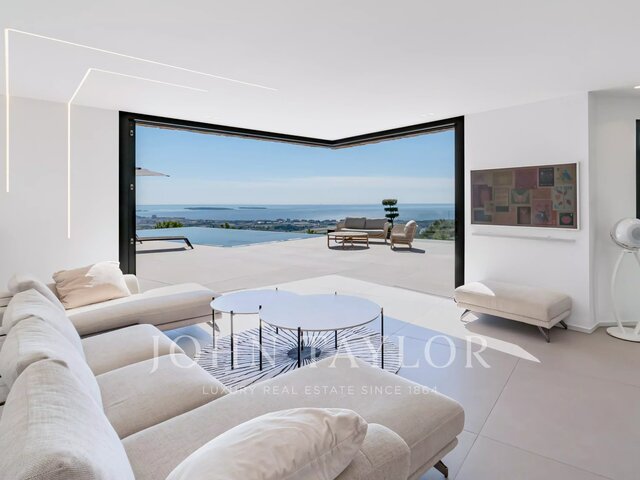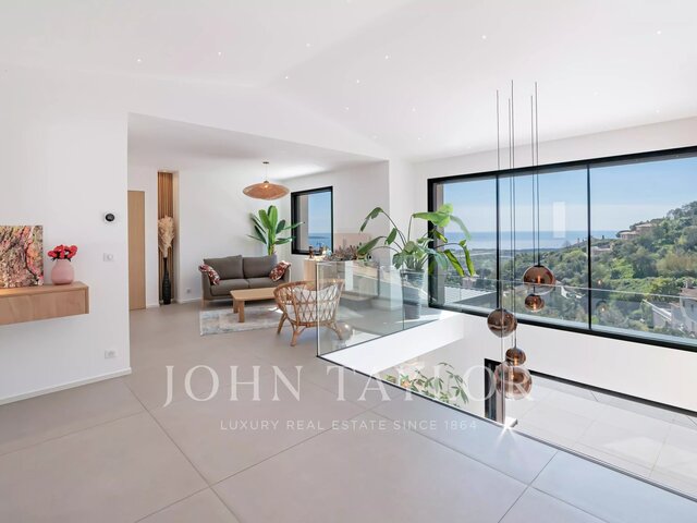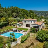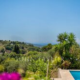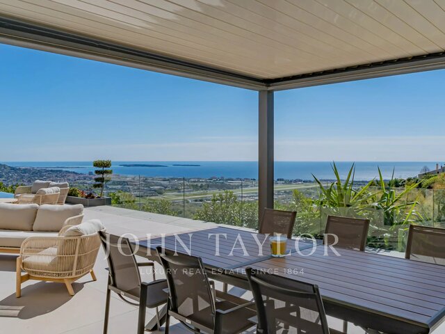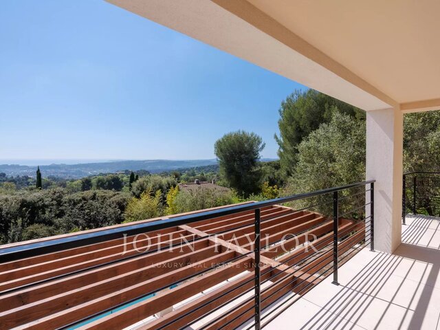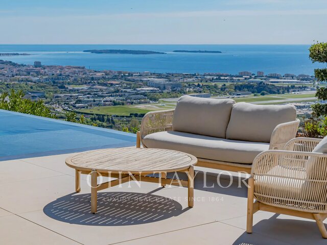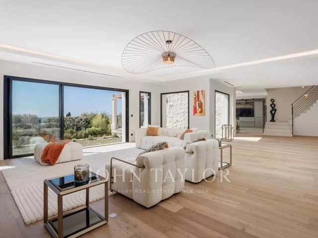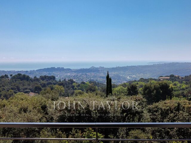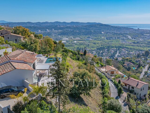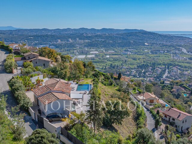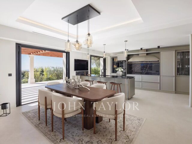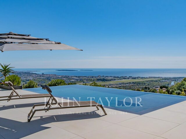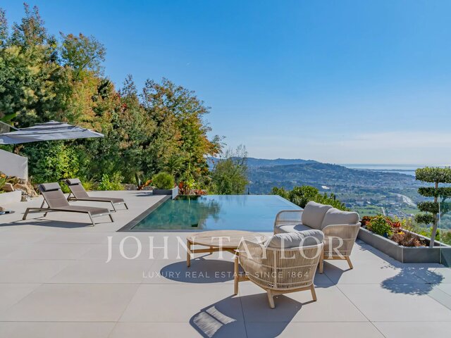 Nestled in the picturesque hills of the backcountry of Cannes, this recently renovated Provençal villa epitomises comfort, luxury, modernity and unrivalled quality, coupled with breathtaking panoramic views as far as the bay of Mandelieu. Access to the villa is through an impressive cathedral entrance, which immediately draws the eye to the spacious, light-flooded living area. The sliding doors of this entire level open onto the magnificent terrace and immediately convey a typical Mediterranean lifestyle. A double living room offers versatile functionality and promises convivial or contemplative hours in front of the open fireplace. The spacious dining room, with room for 12 guests, is directly adjacent to the open, modern Italian kitchen from the renowned Boffi brand, which makes cooking for family or guests a real pleasure. Directly adjacent is a romantic, large summer lounge with impressive ceiling beams, and here too, large sliding doors give the impression of being outside. This room offers a variety of uses that you no longer want to do without. A cosy home cinema with state-of-the-art technology completes the comfort of this level. The first floor, accessible via a lift, houses 4 suites with modern bathrooms, including the master suite with a spacious dressing room. Three of these rooms offer direct access to a large balcony with breathtaking panoramic views. The garden level of the villa inspires a variety of activities: a fitness room with shower, an air-conditioned wine cellar with separate tasting room for wine connoisseurs, a lounge, a guest room with shower and the practical laundry room of the house. From the double garage, you can easily reach all three floors by lift. The idyllic summer area offers the luxury of a pretty infinity pool with a modern pool house and functional kitchen and promises absolute joie de vivre and relaxing moments! The 5000 sq.m park with its own spring was designed by the renowned garden architect Jean Mus and gives this quietly situated property an incomparable touch and this exceptional Mediterranean charm. 35 minutes from Nice and Cannes, surrounded by prestigious golf courses and first-class restaurants, this property fulfils all the criteria for a dream residence !