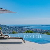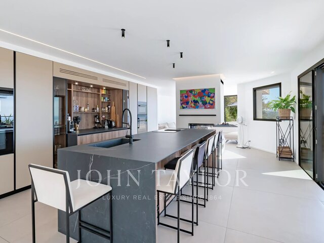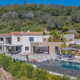 This exceptional property is located in one of the most sought-after areas of Cavalaire-sur-Mer, just 500 m from the beach and 2 km from the town centre and port. It offers breathtaking panoramic views over Cap Lardier, the bay and the port. Designed by an architect and built entirely in 2023, this property extends over a total surface area of more than 410 sq.m, blending in perfectly with a plot of more than 1870 sq.m, planted with Mediterranean trees. The layout includes magnificent terraces, ample parking, a large triple garage, a lift and a superb heated swimming pool. The interior of the house, with its wide windows, is bathed in light, and the property boasts exceptional features on three levels. The main level opens onto a vast living space offering 180-degree panoramic views. This space includes an entrance hall, a fitted kitchen, a utility room, a dining room, a lounge with fireplace and a master suite with dressing room and large bathroom. Every bay window on the plateau offers magnificent views of the sea and pine forest, as well as access to the large outdoor terrace. The garden level comprises three bedrooms, each with its own bathroom, a laundry room and a fully-equipped summer kitchen. The final level contains a triple garage and technical areas. The garage is easy to access and is connected to the house by a lift. This property is a rare gem with exceptional features, located in a highly sought-after area of Cavalaire-sur-Mer. It ticks all the boxes for an exceptional property: luxury, space, prime location and breathtaking views.