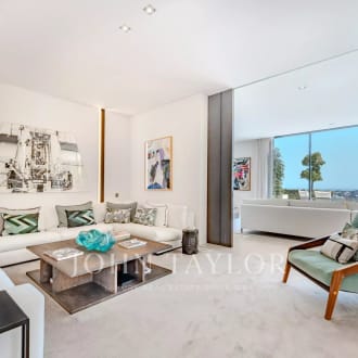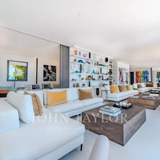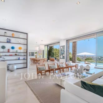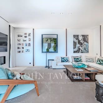 Located in the sought-after Californie district of Cannes, in a prestigious, secure residence with park and swimming pool, we offer this sumptuous 248 sq. m. apartment (215 sq. m. Loi Carrez and 33 sq. m. studio). This exceptional property boasts a superb 60 m² terrace, with breathtaking views over the Mediterranean and the Lérins islands. Entirely renovated by a renowned local architect, using noble materials of the highest quality, the apartment boasts a refined and luxurious contemporary style. Flooded with light and unoverlooked, it guarantees total privacy. It comprises an entrance hall, a vast living-dining room extending onto the terrace, an ultra-modern kitchen enclosed by a glass roof, a TV room, and a master suite with dressing room, bathroom, private access to the terrace and sea view. Two further en suite bedrooms have their own shower rooms and private balconies. A practical laundry room completes the space. An independent studio, two cellars and a parking lot complete the many assets of this unique property.