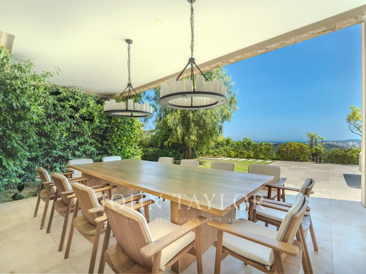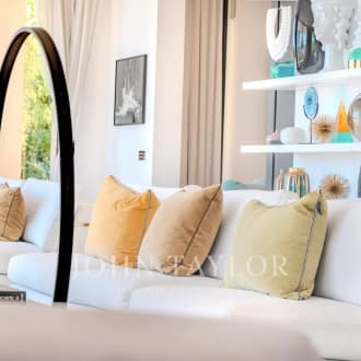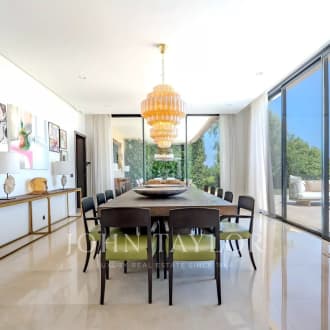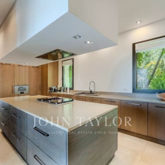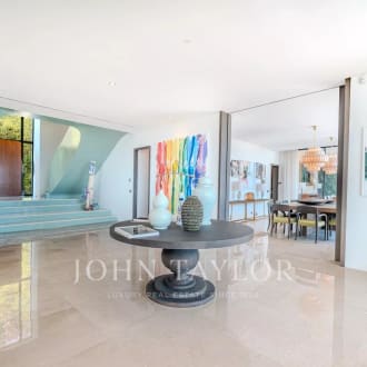 In the heart of a secured 24H/24 domain, Les Parcs de Mougins, sought after for its tranquility and situation close to the Cannes-Mougins Golf Course and the international Mougins School, Villa Palma benefits from panoramic views over the forest hills. The private land of 2980m² is landscaped with various palm trees, and a wonderful heated infinity pool. Villa Palma is a brand modern villa of 357m² + annexes, which has been entirely and richly renovated and decorated in 2013 and offers anything one can dream : space, luxury, comfort for a unique home "ready-to-move-in". Large reception of 100m², master level with terraces, 5 en suite bedrooms, state of the art kitchen, fitness, hammam, and much more...