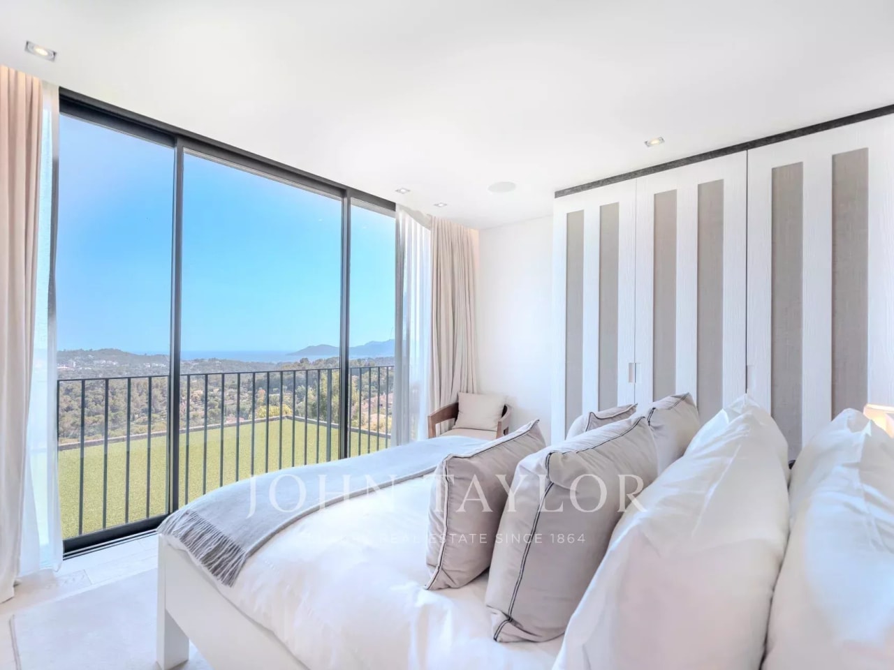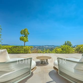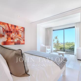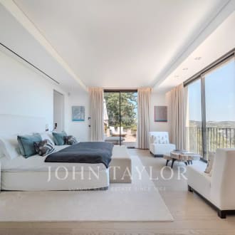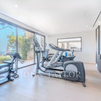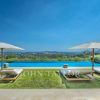 Co-exclusivity. Situated on the heights of Cannes' most coveted hill, this sumptuous property enjoys spectacular panoramic views over the bay, the Lérins islands and the Estérel massif. Completely renovated in a contemporary Provencal style, the property combines refined decor, soft colors and top-of-the-range amenities to create a natural ambience in an idyllic setting representing the art of living in Provence. The villa's interior and exterior design is dedicated to the comfort of its occupants. First floor: entrance, master suite opening onto south-facing terrace with sea view, dressing room, bathroom, shower and toilet; second bedroom opening onto terrace with sea view, shower room and toilet; third bedroom opening onto terrace with sea view, dressing room, bathroom, separate toilet. On the garden level: a vast living room with fireplace opening onto terrace, dining room opening onto terrace also leading onto covered terrace equipped with summer dining room and guest toilet, a beautiful kitchen with wine cellar opening onto terrace, a second fully equipped kitchen with laundry room, and a bedroom with shower room. Staff house of approx. 117 m² comprising a living room with kitchenette, three bedrooms, shower room and toilet. Carport and garage. An independent bedroom with shower room is located on the pool level. Set in beautifully structured landscaped grounds of approx. 7,700 m², the attractive pool area invites you to relax overlooking the Mediterranean Sea. It features a covered terrace equipped with a lounge and summer kitchen with bar, shower and toilet. The infinity pool, which can be heated, includes a Jacuzzi. A fitness room with "Star Trac" equipment also boasts a sea view.