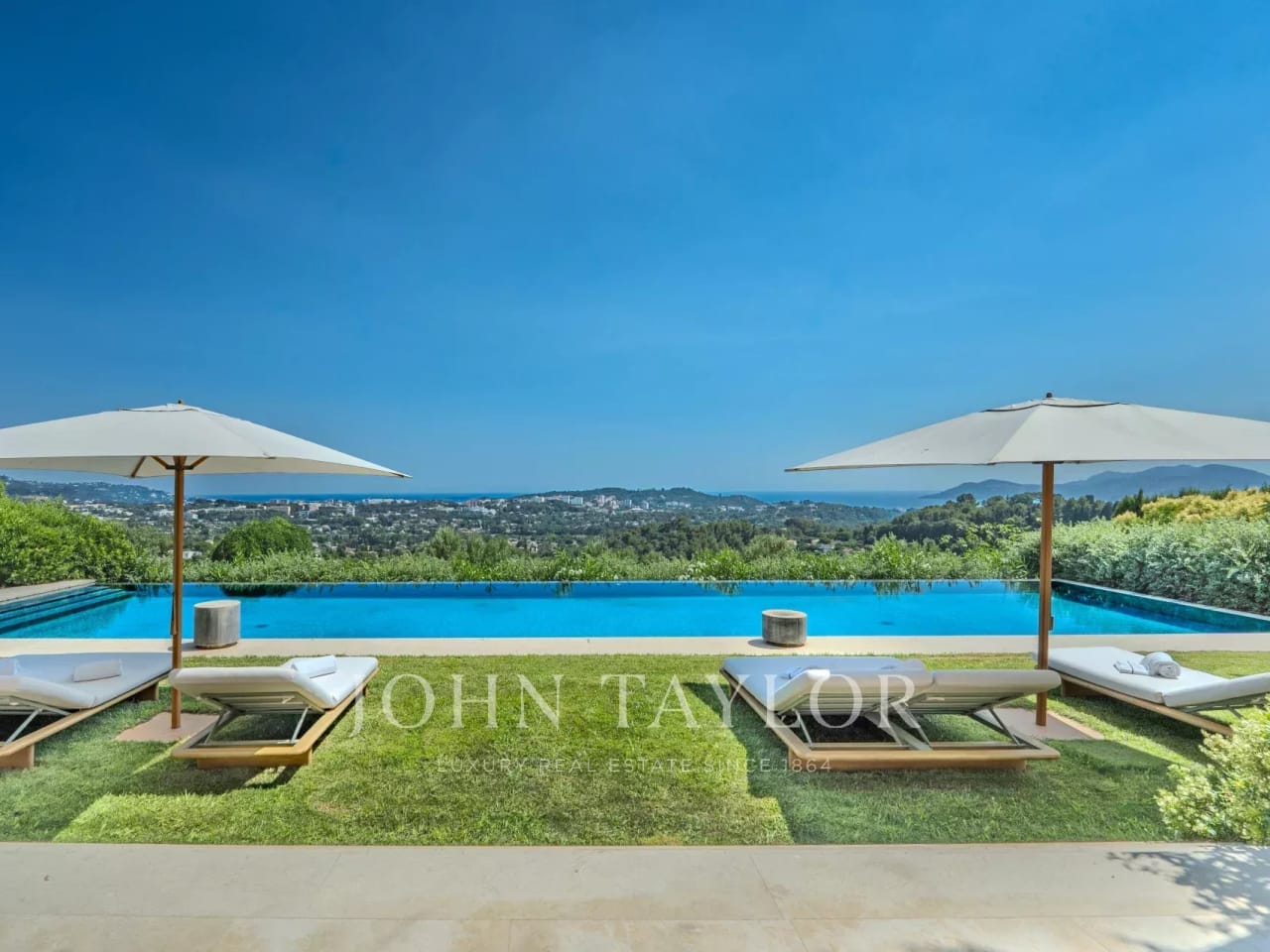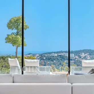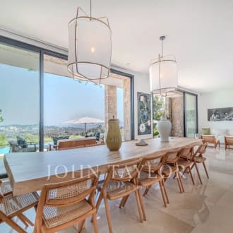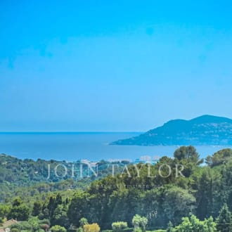 Nestled in the picturesque hills of the backcountry of Cannes, this recently renovated Provençal villa epitomises comfort, luxury, modernity and unrivalled quality, coupled with breathtaking panoramic views as far as the bay of Mandelieu. Access to the villa is through an impressive cathedral entrance, which immediately draws the eye to the spacious, light-flooded living area. The sliding doors of this entire level open onto the magnificent terrace and immediately convey a typical Mediterranean lifestyle. A double living room offers versatile functionality and promises convivial or contemplative hours in front of the open fireplace. The spacious dining room, with room for 12 guests, is directly adjacent to the open, modern Italian kitchen from the renowned Boffi brand, which makes cooking for family or guests a real pleasure. Directly adjacent is a romantic, large summer lounge with impressive ceiling beams, and here too, large sliding doors give the impression of being outside. This room offers a variety of uses that you no longer want to do without. A cosy home cinema with state-of-the-art technology completes the comfort of this level. The first floor, accessible via a lift, houses 4 suites with modern bathrooms, including the master suite with a spacious dressing room. Three of these rooms offer direct access to a large balcony with breathtaking panoramic views. The garden level of the villa inspires a variety of activities: a fitness room with shower, an air-conditioned wine cellar with separate tasting room for wine connoisseurs, a lounge, a guest room with shower and the practical laundry room of the house. From the double garage, you can easily reach all three floors by lift. The idyllic summer area offers the luxury of a pretty infinity pool with a modern pool house and functional kitchen and promises absolute joie de vivre and relaxing moments! The 5000 sq.m park with its own spring was designed by the renowned garden architect Jean Mus and gives this quietly situated property an incomparable touch and this exceptional Mediterranean charm. 35 minutes from Nice and Cannes, surrounded by prestigious golf courses and first-class restaurants, this property fulfils all the criteria for a dream residence !