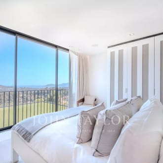 Discover this extraordinary villa that blends contemporary luxury with stunning panoramic views, located in one of the most exclusive areas of Ibiza. Set in an elevated position within a private and secure community, this property offers an experience of peace and privacy with 24-hour gated access. On the upper level, the villa features four spacious bedrooms, all with en-suite bathrooms and walk-in closets. Two of them are expansive master suites with direct access to private terraces that offer spectacular views of Ibiza town and Talamanca Bay. The main floor offers an open-concept living and dining area that seamlessly connects to a kitchen equipped with state-of-the-art appliances, perfect for gourmet cooking enthusiasts. This level also includes an elegant guest bathroom and a functional laundry room. All rooms open to generous terraces offering uninterrupted views and leading to a stunning outdoor area with a dazzling pool, ideal for relaxing or entertaining. An internal staircase leads to the lower level, where panoramic views remain a highlight. This floor includes four additional bedrooms, three bathrooms, and three versatile rooms that can be used as extra bedrooms, a private gym, a cinema room, or any other desired purpose. At the top of the property is an exclusive garage designed as a showroom, with space for several vehicles. Additionally, the villa is crowned with a large terrace the size of the property, ideal for social gatherings, sunbathing, or simply enjoying the views in complete privacy. This villa is the perfect retreat that combines modern design, elegant living spaces, and unparalleled views, making it an ideal choice for those seeking the best of Ibiza.