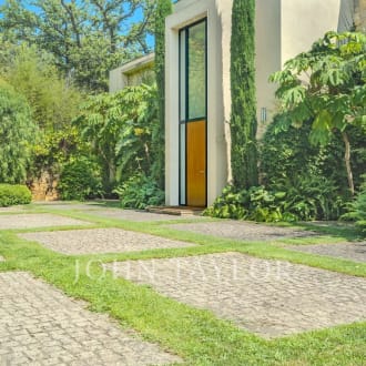 Detached villa for sale in one of the best areas of La Moraleja, with unsurpassed views of the golf course. The house, designed by the prestigious master architect Prof. Javier Carvajal, has a timeless and avant-garde design. It is built on a plot of 3,211 sqm, which has a permanent water spring and enjoys unique historical constructions. The location of this unique plot allows us to have a quiet access through a cul-de-sac that, with only 3 houses, provides maximum privacy and at the same time guarantees the total absence of noise, providing a large parking area for visitors. The property has been completely renovated in 2020. With an area of approximately 876 sqm, all rooms are very bright, being oriented at noon. The house is accessed from the upper floor, through a wide pedestrian access of 3 m. wide, on one side of which has been built a Japanese garden and on the other, a pond of water that cascades into the pool. The house has two living rooms with different atmospheres and two fireplaces, a living room, an interior circular dining room with a patio, and a cinema room with capacity for 14 people. The rest area has 4 bedrooms -2 of them en suite-, 2 more can be extended with a minor work, 3 bathrooms and a guest toilet, as well as a service apartment with 2 bedrooms, totally independent. The master bedroom with a surface area of 63 m², accessed through an original Indonesian door to the private circular hall, living area with fireplace and air conditioning, separate oak dressing room, bathroom in travertine marble with whirlpool tub, separate shower overlooking the golf course and its own circular terrace for this room. In the garden, very consolidated, there is another summer dining room (with professional wood oven and barbecue), a cozy chill-out, a toilet with dressing room, a wine cellar that includes a circular games room of 20 m², made of tile bricks, and an office of 35 m². The garden has been raised above the golf course to optimize the views. The swimming pool, equipped with a waterfall and a built-in Jacuzzi, blends in perfectly with the unique old buildings on this plot - a grotto and a watchtower dating from the 18th century - while respecting the spirit of the area. A permanent water spring that once served the Palace of La Moraleja and that gives its name to Camino de la Fuente Street reaches the same plot through a brick tile gallery. In the kitchen we find two cozy dining rooms, one indoor and one outdoor -this is accessed by a glass floor-, two offices, a large pantry with forklift directly connected to the parking and a bright ironing room and laundry. The kitchen, the two offices and the laundry room have been furnished and designed by SANTOS kitchens, a benchmark of high quality in its sector. A service apartment, independent of the main house, with two bedrooms (or bedroom and living room) and bathroom. Other rooms with various uses (closets, gardening, security, etc.) complete the built areas. Covered parking for two cars and uncovered parking for at least six more (the covered parking can be transformed into a closed garage with minor work and part of the uncovered parking can easily be covered). The house enjoys an extraordinary insulation as it is built in thick concrete which was then lined with tile bricks. Underfloor heating system (natural gas), consisting of 42 independent sectors, to be connected at will, thus ensuring considerable energy savings. Complete security system, including night video cameras, connected to an alarm center. To highlight the excellent architectural design of the property, which has been published in 8 architectural books, as well as its location and its excellent state of conservation.