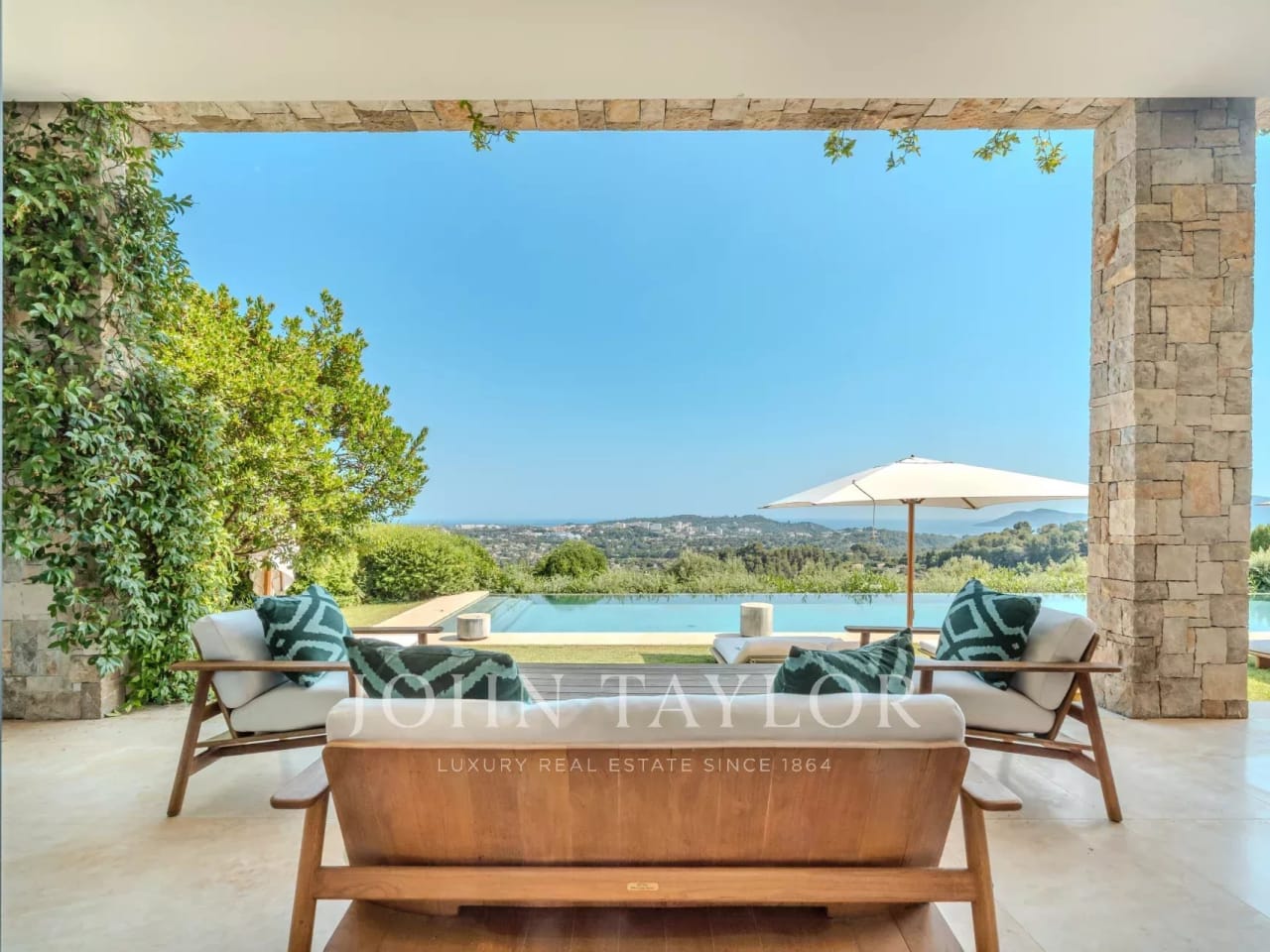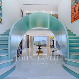 On the hills of La Colle-sur-Loup, in the most prestigious neighborhood of the Saint-Paul de Vence area, a majestic stone-built property of 800sq.m designed by a well known local architect benefits from magnificent sea and forest views on its massive landscaped grounds of approximately 1 hectare with its large heated infinity pool. A welcoming courtyard leads us to the property which comprises of an entrance hall, 3 sitting rooms, a dining room, a kitchen with pantry, a large well furnished covered terrace with bar, outside kitchen, TV area, 6 bedrooms and 5 bathrooms. On the lower floor, a relaxing wellness room with massage room, jacuzzi, sauna, hammam, a music room/dancing room, a cinema, a wine cellar and a 1-bedroom apartment. Completely independent and well integrated in the landscaped parc, a large gym with a reclining climbing wall, changing room and tennis court will enable the most sportive guests to use every aspect of the property ! Garages for 6 véhicules, numerous parking spots, 1-bedroom apartment for the caretaker and a studio/security room, technical and staff rooms.