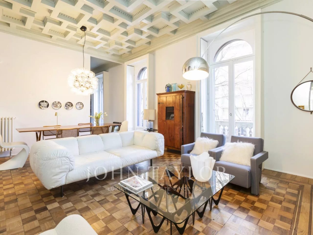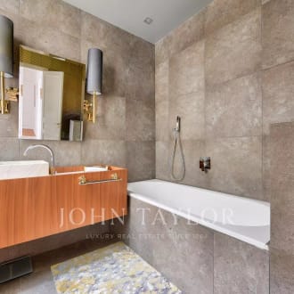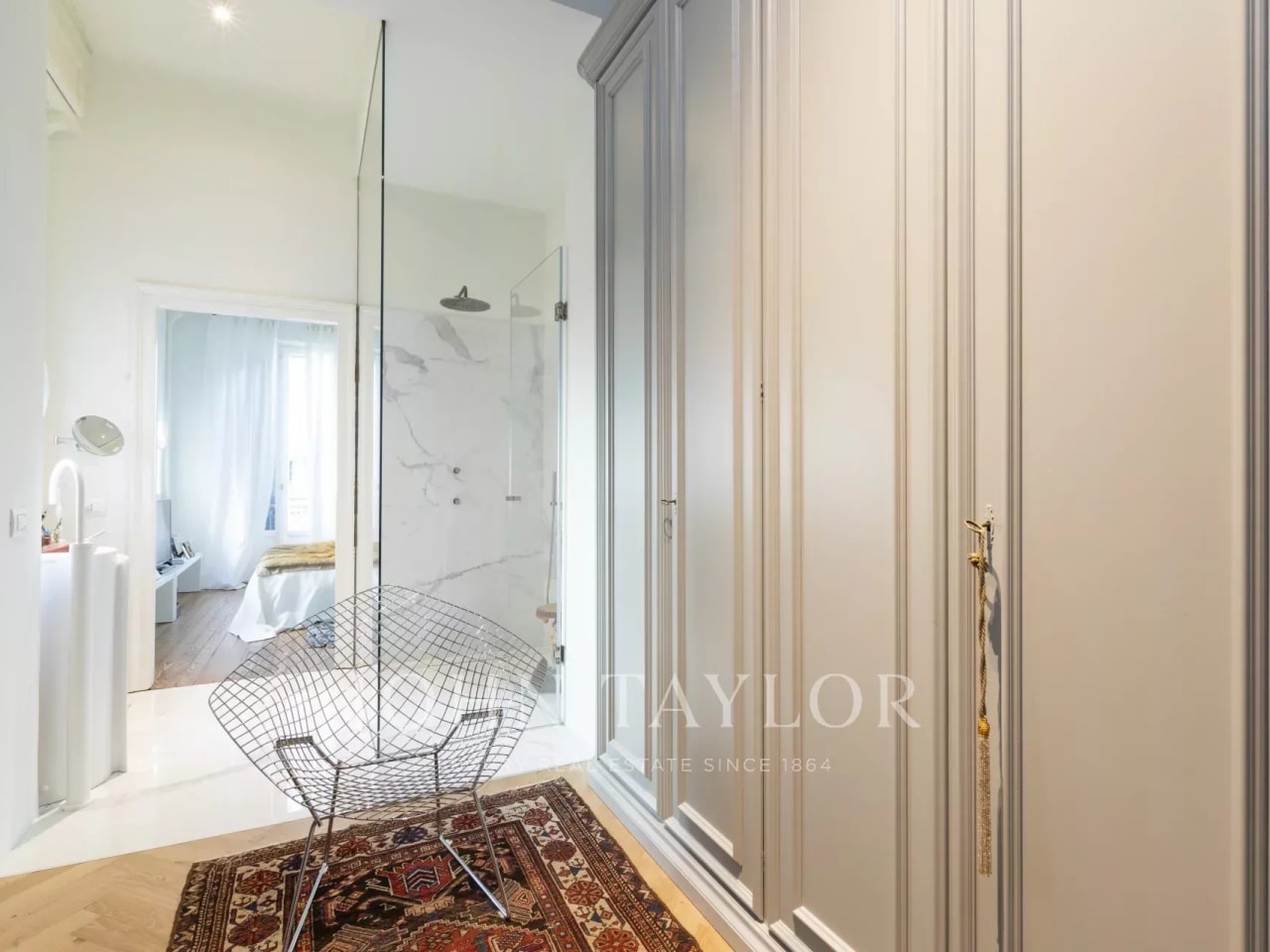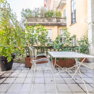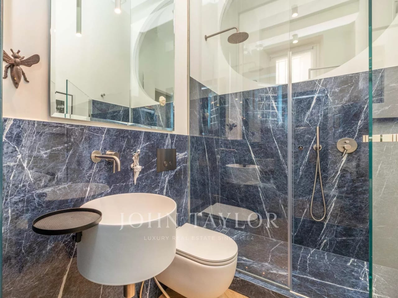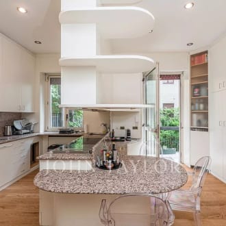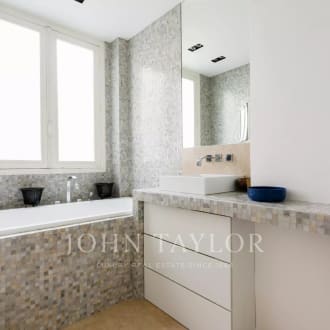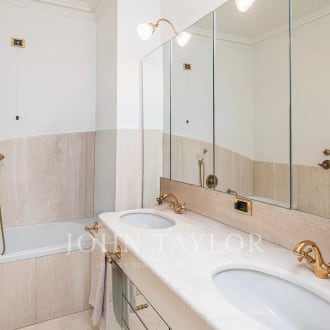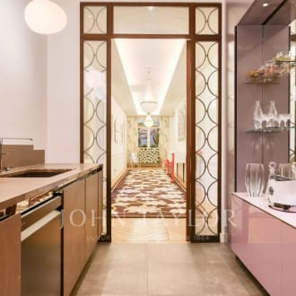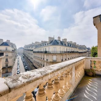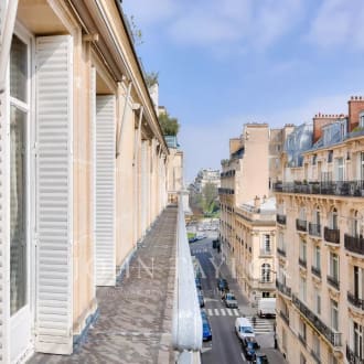 Paris 8. Montaigne. In the heart of the Golden Triangle, in a superb old building, amazing penthouse apartment on the top floors. With a surface area of 186.10 m2 loi Carrez (196.71 m2 on the ground), on the top floors, it is composed as follows: 5th floor : - entrance with guest cloackroom - magnificent double-height living room (5.70 m high ceilings) with access to an nice balcony (13.40 m2) - fitted and equipped kitchen opening onto the living room - spacious master bedroom on courtyard with access to another large balcony-terrace (14.80 m2), marble bathroom, dressing room - 2 further courtyard bedrooms with en-suite shower rooms 6th floor : - study - bedroom - shower room Apartment renovated by a renowned architect, bright, quiet and fully air-conditioned. Cellar in basement and 20 m2 studio included. Just a minute from Avenue Montaigne and Rue François 1er, close to all the luxury boutiques and Palace Hotels of the Golden Triangle.
