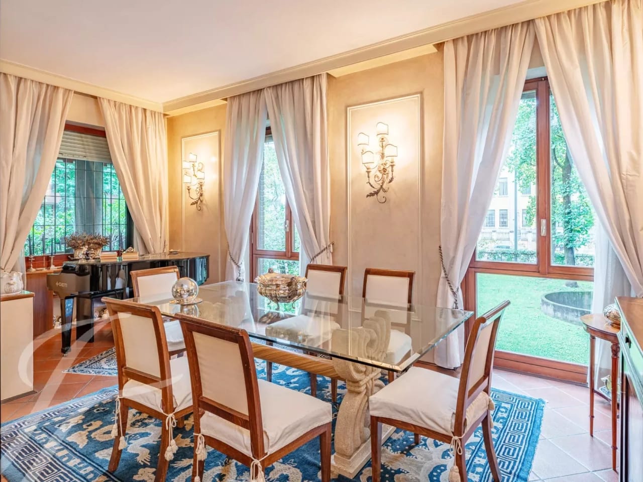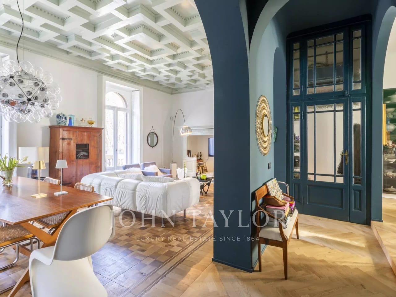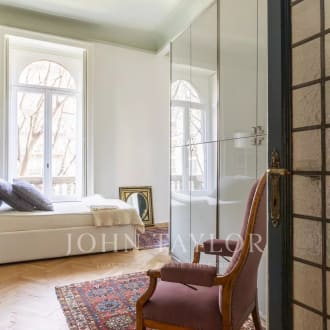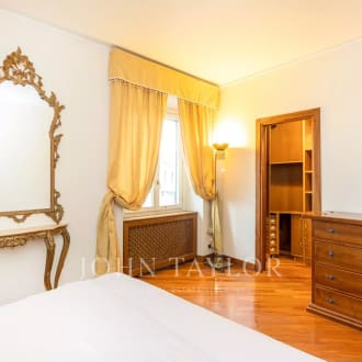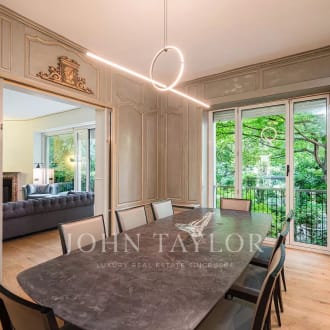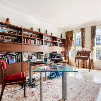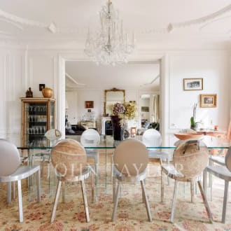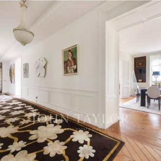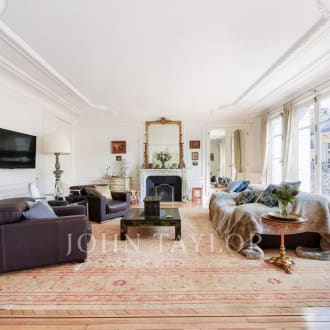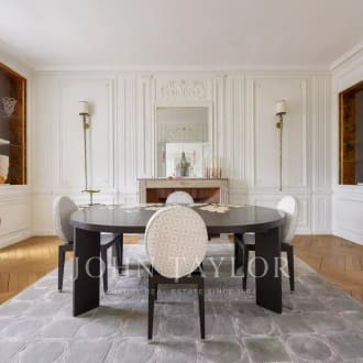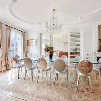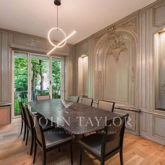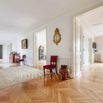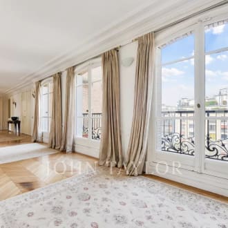 Paris 16 - Victor Hugo Avenue Victor Hugo/Henri Martin, on the 3rd floor of a luxury building, superb 347 sq.m. apartment, luxuriously renovated, offering vast and beautiful spaces with 3.50 m high ceilings, including : - A beautiful entrance gallery, - A large corner lounge with balcony, - A dining room, - A fully-equipped galley kitchen, - A study - A master suite with dressing room and marble bathroom, - Three bedrooms, each with its own shower room and toilet, - A sports room (5th bedroom), - A laundry room, - Guest toilet. - Plenty of built-in storage. Very sunny (South/East exposure), air-conditioned apartment. Plan perfectly dividing reception and private areas. Janitor in the building. Renovated high-quality common areas. A cellar completes this property. Parking solutions in the immediate vicinity.