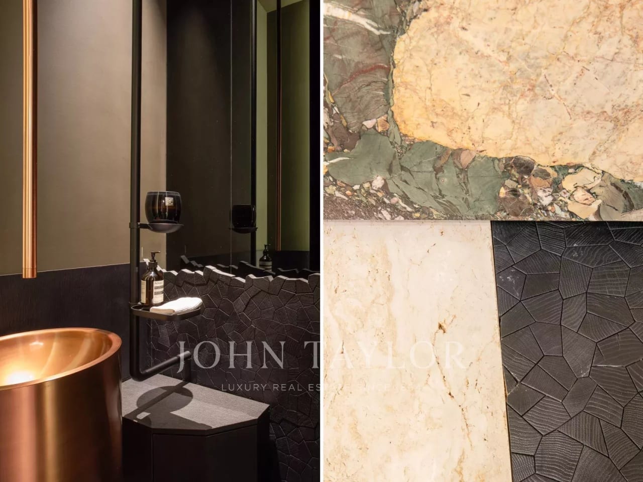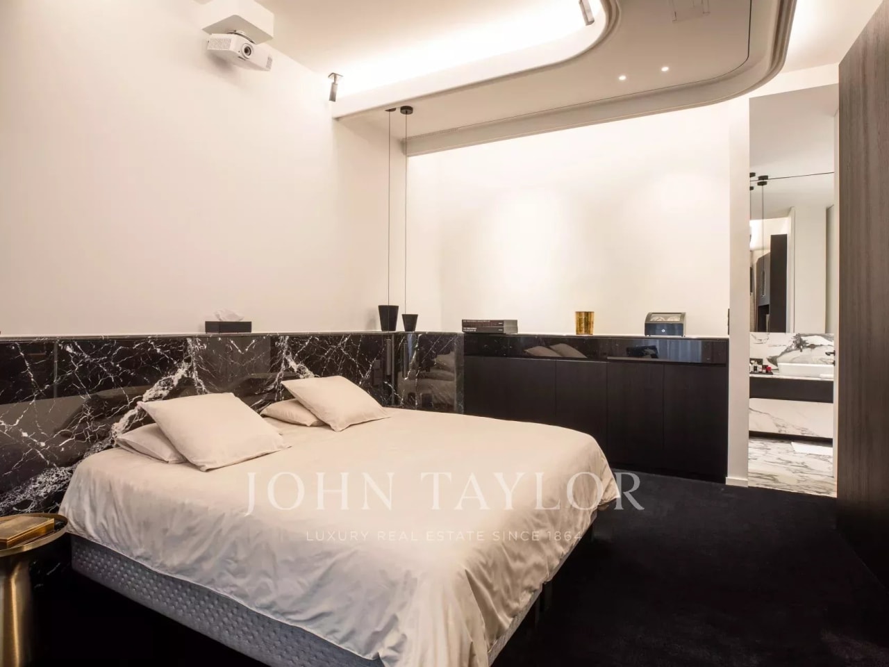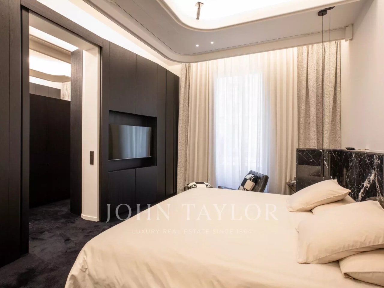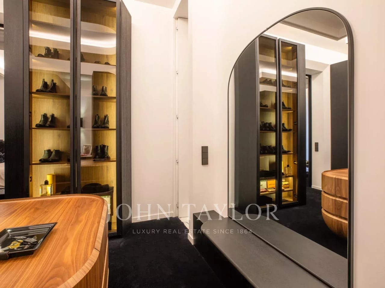 Paris 8. Montaigne. In the heart of the Golden Triangle, in a superb old building, amazing penthouse apartment on the top floors. With a surface area of 186.10 m2 loi Carrez (196.71 m2 on the ground), on the top floors, it is composed as follows: 5th floor : - entrance with guest cloackroom - magnificent double-height living room (5.70 m high ceilings) with access to an nice balcony (13.40 m2) - fitted and equipped kitchen opening onto the living room - spacious master bedroom on courtyard with access to another large balcony-terrace (14.80 m2), marble bathroom, dressing room - 2 further courtyard bedrooms with en-suite shower rooms 6th floor : - study - bedroom - shower room Apartment renovated by a renowned architect, bright, quiet and fully air-conditioned. Cellar in basement and 20 m2 studio included. Just a minute from Avenue Montaigne and Rue François 1er, close to all the luxury boutiques and Palace Hotels of the Golden Triangle.