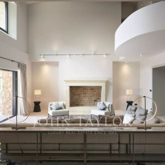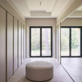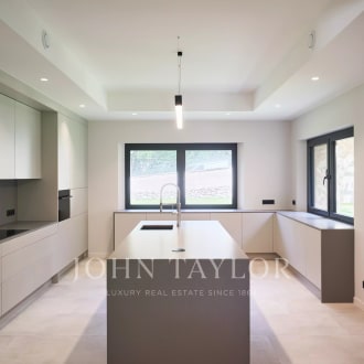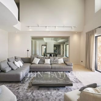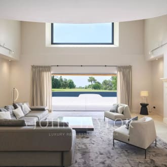 In the heart of a secured 24H/24 domain, Les Parcs de Mougins, sought after for its tranquility and situation close to the Cannes-Mougins Golf Course and the international Mougins School, Villa Palma benefits from panoramic views over the forest hills. The private land of 2980m² is landscaped with various palm trees, and a wonderful heated infinity pool. Villa Palma is a brand modern villa of 357m² + annexes, which has been entirely and richly renovated and decorated in 2013 and offers anything one can dream : space, luxury, comfort for a unique home "ready-to-move-in". Large reception of 100m², master level with terraces, 5 en suite bedrooms, state of the art kitchen, fitness, hammam, and much more...
