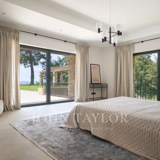 Co-exclusivity. Situated on the heights of Cannes' most coveted hill, this sumptuous property enjoys spectacular panoramic views over the bay, the Lérins islands and the Estérel massif. Completely renovated in a contemporary Provencal style, the property combines refined decor, soft colors and top-of-the-range amenities to create a natural ambience in an idyllic setting representing the art of living in Provence. The villa's interior and exterior design is dedicated to the comfort of its occupants. First floor: entrance, master suite opening onto south-facing terrace with sea view, dressing room, bathroom, shower and toilet; second bedroom opening onto terrace with sea view, shower room and toilet; third bedroom opening onto terrace with sea view, dressing room, bathroom, separate toilet. On the garden level: a vast living room with fireplace opening onto terrace, dining room opening onto terrace also leading onto covered terrace equipped with summer dining room and guest toilet, a beautiful kitchen with wine cellar opening onto terrace, a second fully equipped kitchen with laundry room, and a bedroom with shower room. Staff house of approx. 117 m² comprising a living room with kitchenette, three bedrooms, shower room and toilet. Carport and garage. An independent bedroom with shower room is located on the pool level. Set in beautifully structured landscaped grounds of approx. 7,700 m², the attractive pool area invites you to relax overlooking the Mediterranean Sea. It features a covered terrace equipped with a lounge and summer kitchen with bar, shower and toilet. The infinity pool, which can be heated, includes a Jacuzzi. A fitness room with "Star Trac" equipment also boasts a sea view.