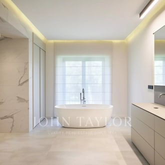 John Taylor Luxury Real Estate is promoting an impressive single-family house in concrete of different textures and unique design in the exclusive area of Valdemarin. Designed by the prestigious architects Joaquín Torres and Rafael Llamazares of studio A-cero, backed by different awards throughout his successful career, among which is this excellent and unique home called Open Box, where volumes, light and materials are their hallmark. DISTRIBUTION: MAIN FLOOR: Main living room with dining room, TV room, kitchen, courtesy toilet, office, games room, guest room with bathroom. The house is very bright with large windows, in some cases 10 m, with metal locks by SCHÜCO and TECNHAL doors. It is accessed through an 8 m high glass door which leads to a spacious 22 m² hall leading to the main living and dining room with a double height of 106 m². There is a gas fireplace with remote control of 6 meters long that divides the main living room from the TV room of 33 m² which is accessed by going down 4 steps. The entire wall of the house overlooking the outdoor pool of 16m*5m would be glass windows which makes a glass wall of about 28 meters. Behind the TV room is the children's playroom followed by the guest room with its complete bathroom both rooms with access to the pool overlooking the garden and the pool. On this floor would also be the office, with exit to the garden, a courtesy aces, as well as mutile built-in wardrobes. The white corian kitchen by BOFFI, with GAGGENAU induction hob and SUBZERO oven with two glazed walls leading to the garden and with a large daily office for crockery, pantry etc. and a cleaning room. There are many built-in wardrobes throughout the house and floor to ceiling doors of 2.70 cm (height) of 12 cm thick. TOP FLOOR: you go from two stairs, the main one would go up to three large and bright rooms each with its bathroom with glass walls balance and Corian furniture. A 10m glass walkway would then give way to the spacious 120m diaphanous suite plus a 22m² double dressing room that is hidden by a wall with a Mondrian mirror set. 3*3 TEUCO Jacuzzi. Shower of 3,8m². The room has a gas fireplace with remote control in a custom-made cabinet with many wardrobes hidden in the same Mondrian dressing room with a dressing table in the background. The television with Future Automation support is hidden in the ceiling. At the back of the room would be the second staircase that connects the 3 floors. Basement: a practical service area with two bedrooms, bathroom and living room. with direct access to the 30m long English courtyard with a line of cypresses, Garage for 6 cars fitted out for party room with coloured lights on the ceiling. Laundry room with sink of 22 m². Storage room of 32 m² Four gardener used as a second storeroom. Installations room with double boiler. Highlight that this is a fabulous plot with a consolidated garden with swimming pool and a large porch with TV also hidden in the ceiling. Domotics with KNX system integrated with security, lighting, blinds, air conditioning and underfloor heating throughout the house. Pushbuttons lighting and blinds by Berker. Natural stone in interior and exterior flooring in Italian Basaltita. Red Int and ext category 8 wiring. 3 Supports TVs 50" integrated in ceilings of Future Automation. Technical lighting for the entire house of the prestigious Italian firm Viabizzuno.