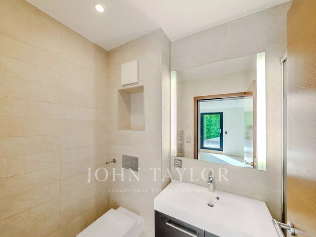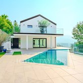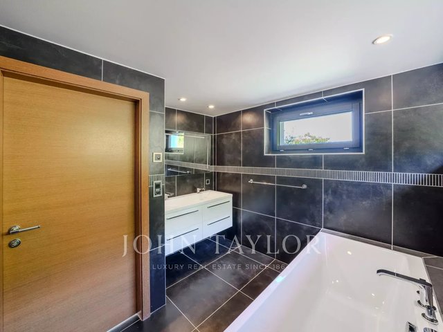 Gorgeous modern villa of 420 sqm built on an enclosed field of 2500 sqm with pool, in a private closed domain. At the ground floor : an entrance, a living room with fireplace, a study & tv lounge, a fitted kitchen, a laundry room, one bedroom with shower room. First floor : 2 en suite bedrooms with bathroom/shower room, a master bedroom with a large dressing and a shower room. The bedrooms are giving onto large terraces. Basement : a wine cellar, numerous storage areas, a separated bedroom with shower room. Garage, caretaker’s apartment and a guest house including 2 bedrooms and 2 shower rooms. Pool house.