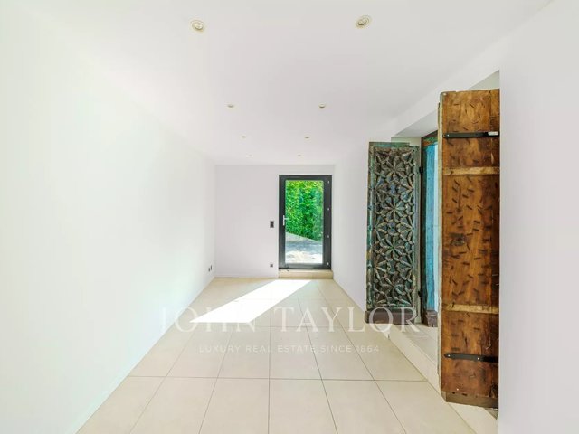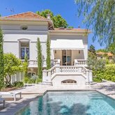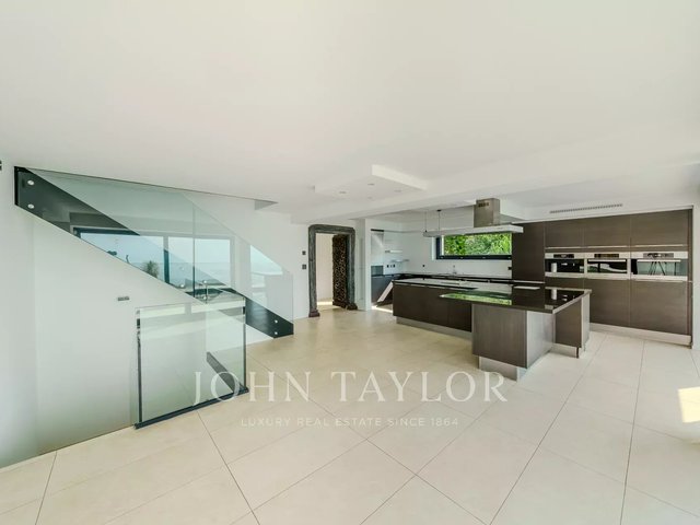 Co-exclusivity. Situated on the heights of Cannes' most coveted hill, this sumptuous property enjoys spectacular panoramic views over the bay, the Lérins islands and the Estérel massif. Completely renovated in a contemporary Provencal style, the property combines refined decor, soft colors and top-of-the-range amenities to create a natural ambience in an idyllic setting representing the art of living in Provence. The villa's interior and exterior design is dedicated to the comfort of its occupants. First floor: entrance, master suite opening onto south-facing terrace with sea view, dressing room, bathroom, shower and toilet; second bedroom opening onto terrace with sea view, shower room and toilet; third bedroom opening onto terrace with sea view, dressing room, bathroom, separate toilet. On the garden level: a vast living room with fireplace opening onto terrace, dining room opening onto terrace also leading onto covered terrace equipped with summer dining room and guest toilet, a beautiful kitchen with wine cellar opening onto terrace, a second fully equipped kitchen with laundry room, and a bedroom with shower room. Staff house of approx. 117 m² comprising a living room with kitchenette, three bedrooms, shower room and toilet. Carport and garage. An independent bedroom with shower room is located on the pool level. Set in beautifully structured landscaped grounds of approx. 7,700 m², the attractive pool area invites you to relax overlooking the Mediterranean Sea. It features a covered terrace equipped with a lounge and summer kitchen with bar, shower and toilet. The infinity pool, which can be heated, includes a Jacuzzi. A fitness room with "Star Trac" equipment also boasts a sea view.