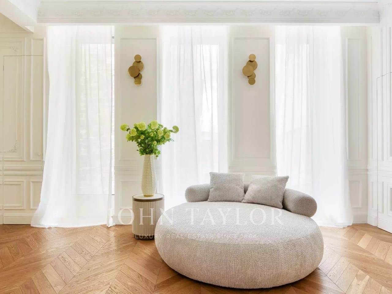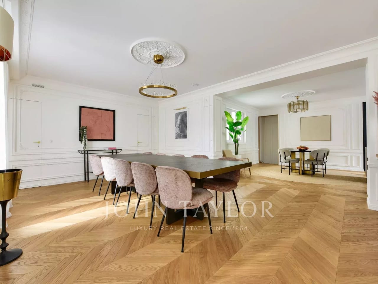 Paris 16 - Victor Hugo Avenue Victor Hugo/Henri Martin, on the 3rd floor of a luxury building, superb 347 sq.m. apartment, luxuriously renovated, offering vast and beautiful spaces with 3.50 m high ceilings, including : - A beautiful entrance gallery, - A large corner lounge with balcony, - A dining room, - A fully-equipped galley kitchen, - A study - A master suite with dressing room and marble bathroom, - Three bedrooms, each with its own shower room and toilet, - A sports room (5th bedroom), - A laundry room, - Guest toilet. - Plenty of built-in storage. Very sunny (South/East exposure), air-conditioned apartment. Plan perfectly dividing reception and private areas. Janitor in the building. Renovated high-quality common areas. A cellar completes this property. Parking solutions in the immediate vicinity.