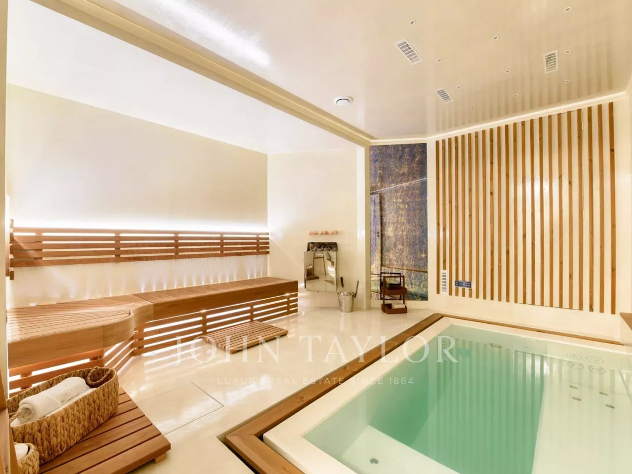 In one of the most prestigious residences on the Croisette, near Port Canto, with a superb view over the Bay of Cannes, magnificent duplex apartment with 580 m² of living space. The apartment's seductive decor, top-of-the-range amenities, 428 m² of terraces and indoor rooftop pool (7m x 3.5m). On the 7th floor, the apartment comprises an entrance hall opening onto a beautiful reception room with living room and dining room opening onto terrace, fully equipped kitchen, wine cellar, laundry room, storage room, master bedroom with dressing room, full Madame bathroom and Monsieur shower room, bedroom opening onto terrace with shower room, as well as a guest toilet. Two further bedrooms with en suite bathrooms overlooking the Croisette and a fifth bedroom with en suite shower room and view of Cap d'Antibes. Children's dance and games room. On the 8th floor, the apartment comprises an entrance hall opening onto a beautiful reception room with living room and dining room opening onto a terrace, fully equipped summer kitchen with wine cellar, guest toilet, as well as an indoor swimming pool (7mx3.5m), sauna, hammam and shower. 3 garages, 3 utility rooms and a cellar.
