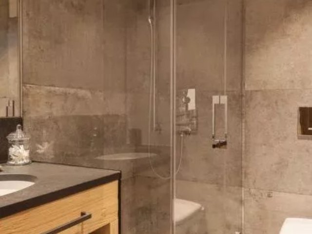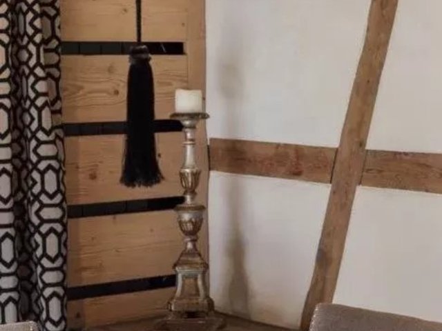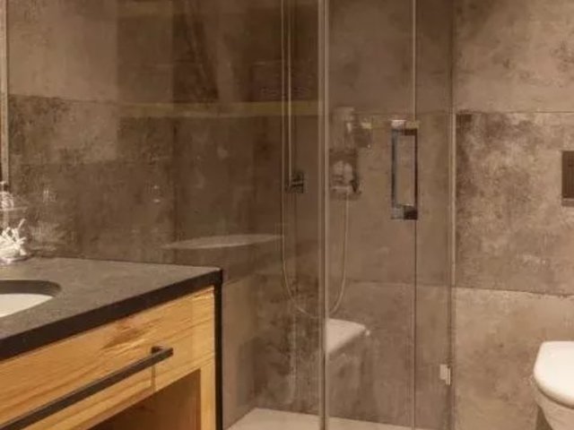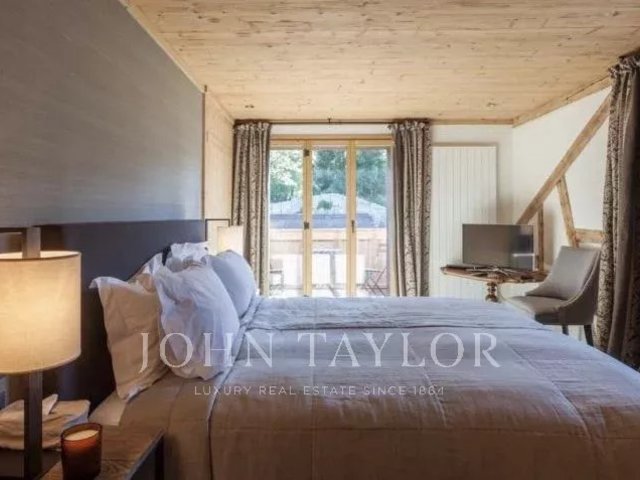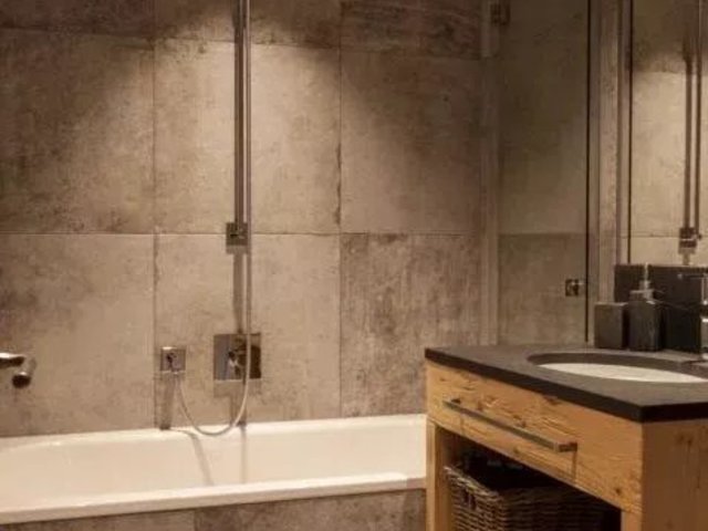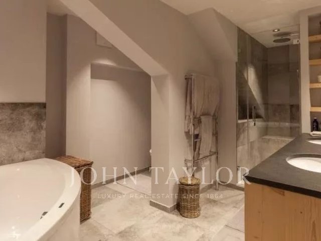 The open plan living area is spacious and comfortable. Cleverly exposed beams, sensitive design and plush furnishings creates a wonderful homely atmosphere. Large sofas surround the grand stone fireplace whilst neutral colours flow throughout this chalet style apartment.