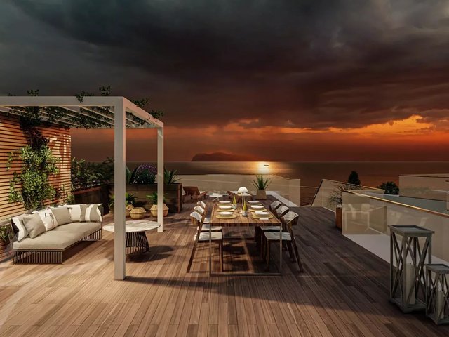 First-floor residences boast a spacious living area with panoramic windows overlooking the Gulf of Follonica and the marina. Two double bedrooms, two bathrooms, and a large rooftop terrace over 110 m² offer a unique open space suspended just steps from the sea.