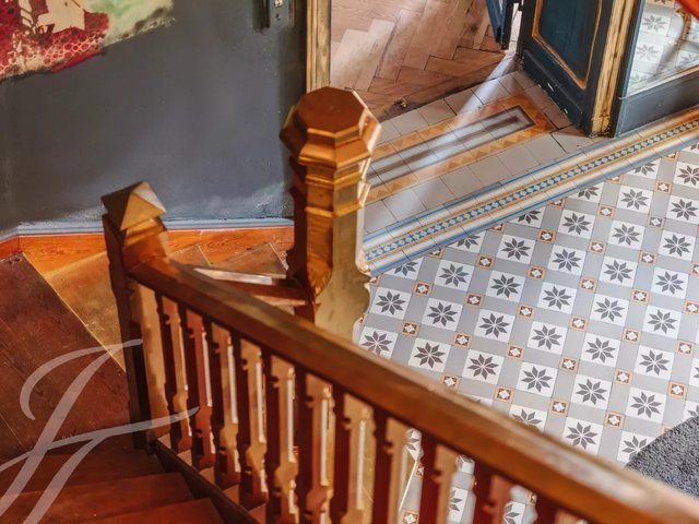 Fine materials such as stained glass windows, cement tiles, parquet flooring, and woodwork beautifully adorn the interior spaces.