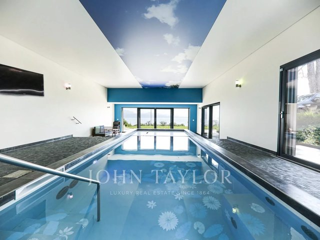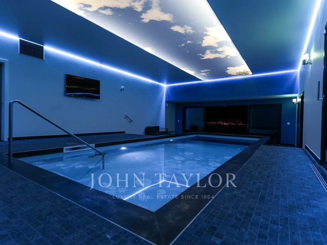 Modern comforts include an elevator, a gym with sauna, and a jacuzzi integrated into the large indoor pool for unparalleled relaxation. The outdoor relaxation pool on the 1st floor, lined with landscape lights, becomes the center of attraction during the summer months. Electric blinds and a sophisticated alarm system add to the convenience and security of this residence.