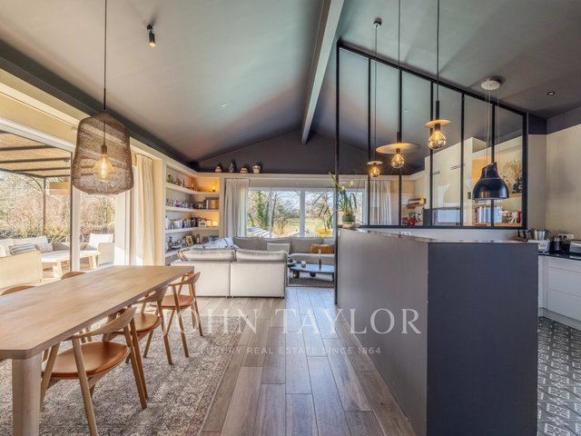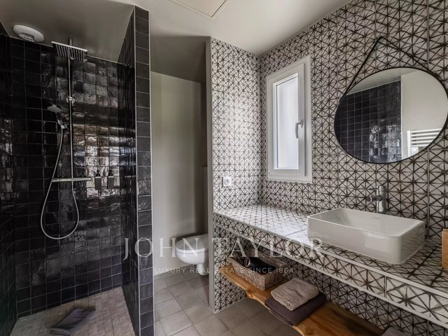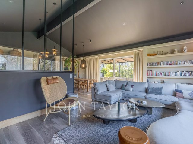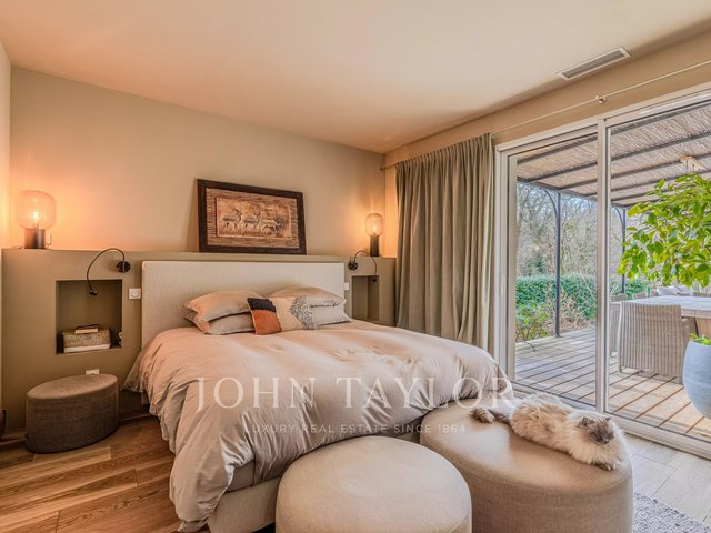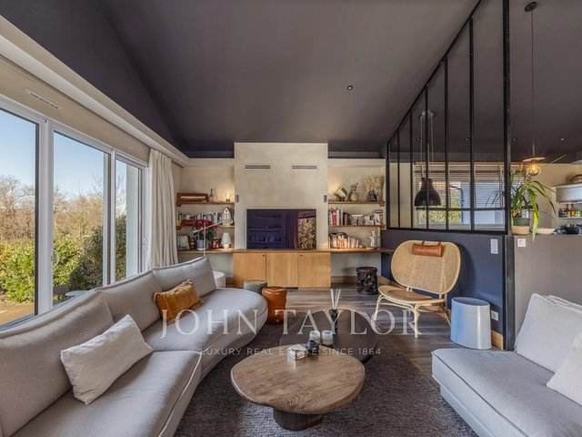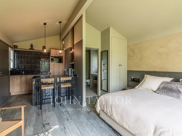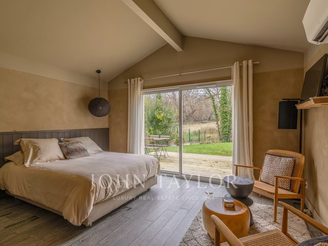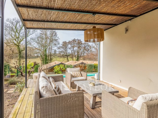 The main house stands out with a contemporary architecture with clean lines and large folding glass doors offering remarkable brightness. The living room opens onto a covered terrace and a swimming pool harmoniously integrated into the landscape.