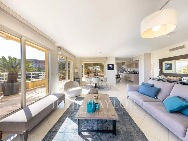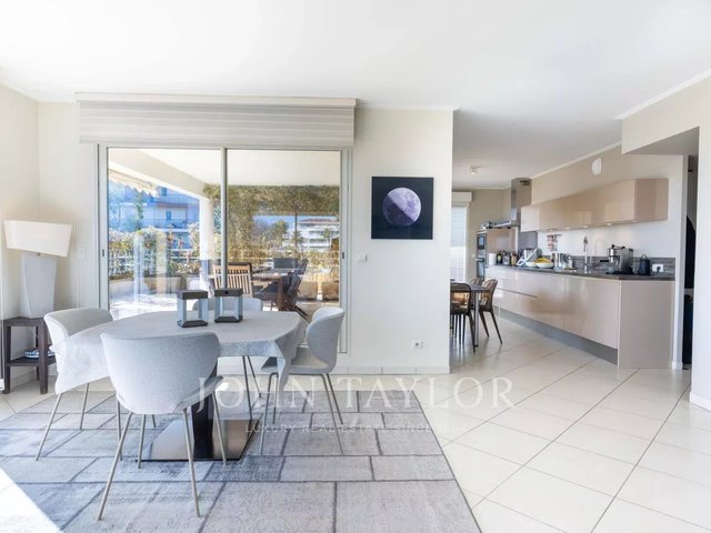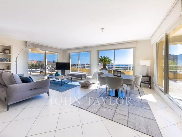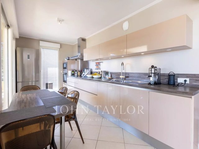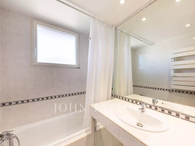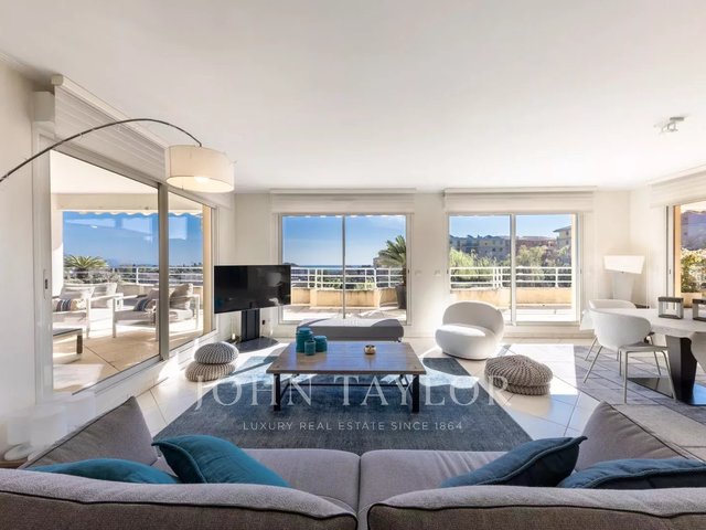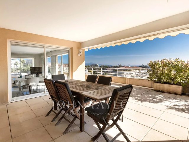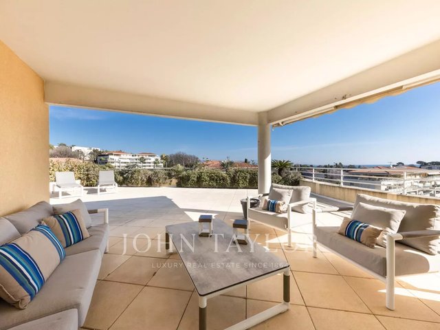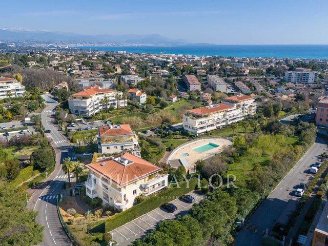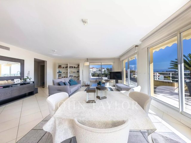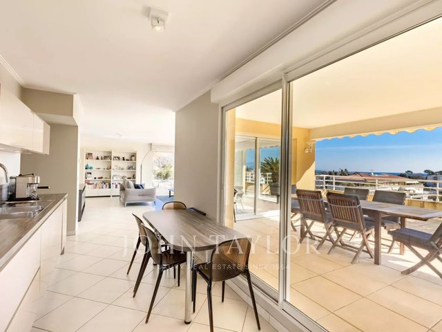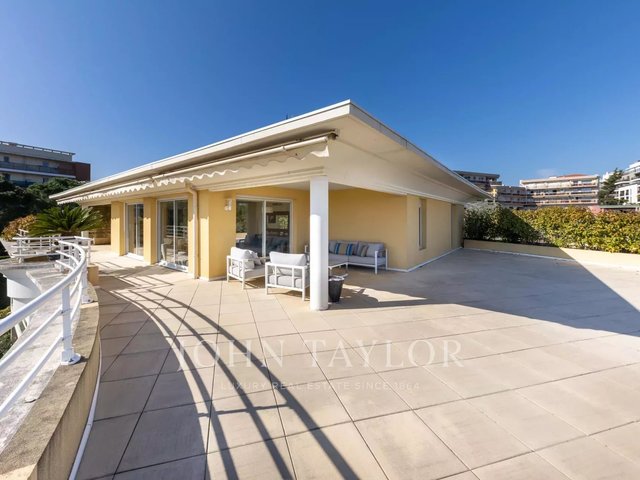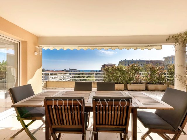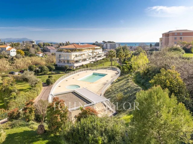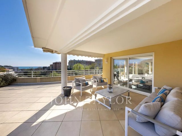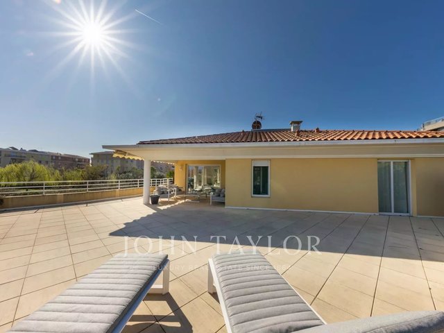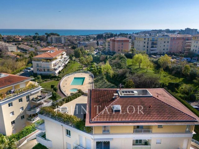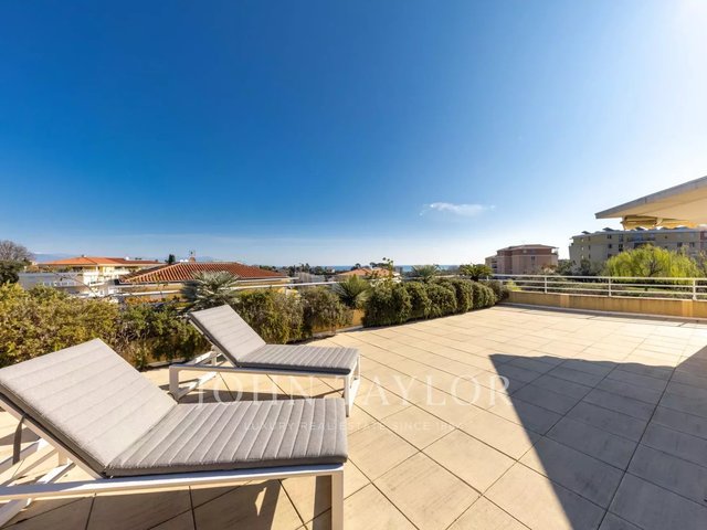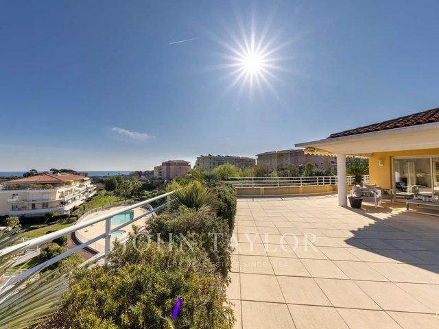 Beautiful 136m² penthouse with a lovely sea view and a 174sqm terrace, located in an elegant luxury residence with a swimming pool and controlled access. A peaceful residential area with amenities nearby. Private access to the villa via elevator, entrance hall, spacious 42sqm living/dining room opening onto the terrace, beautiful fitted kitchen, a beautiful master bedroom with dressing room, shower room and toilet, three bedrooms, toilet, a bathroom and a shower room. Two garages and one cellar.