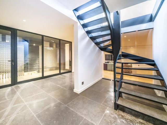 The main entrance gives access to a hall with to the left the kitchen; opposite a staircase to the first floor, a corridor with to the right a WC and to the left an ensuite bedroom; to the right a large open space including the dining room and the living room. Doors slide fully open to garden (indoor outdoor flow)