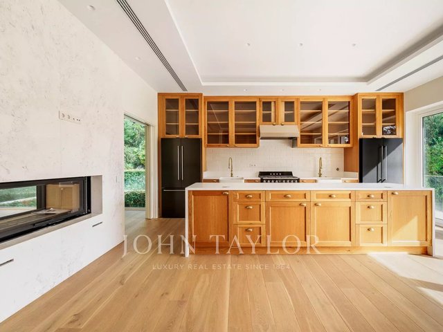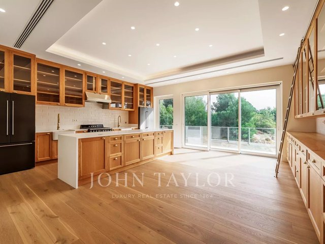 The house is arranged over two floors. On the main level, a spacious living room opens through full-height windows onto the garden and pool, creating a strong connection to the outdoors and flooding the interior with natural light. The kitchen, sleek and fully equipped with high-end appliances, is designed to function equally well for family life or entertaining.