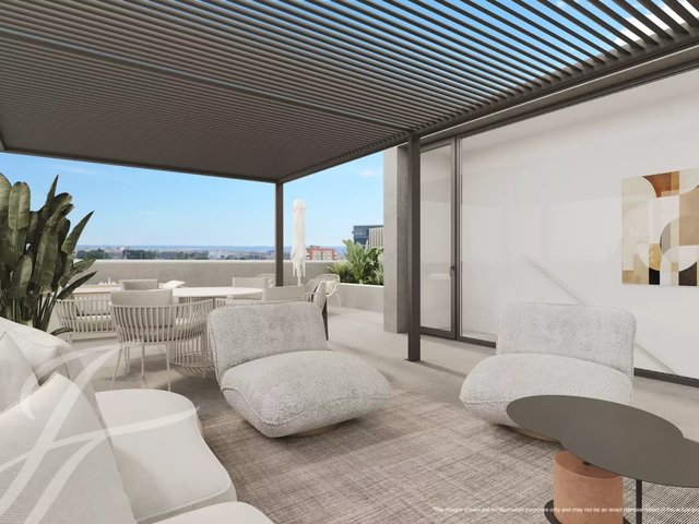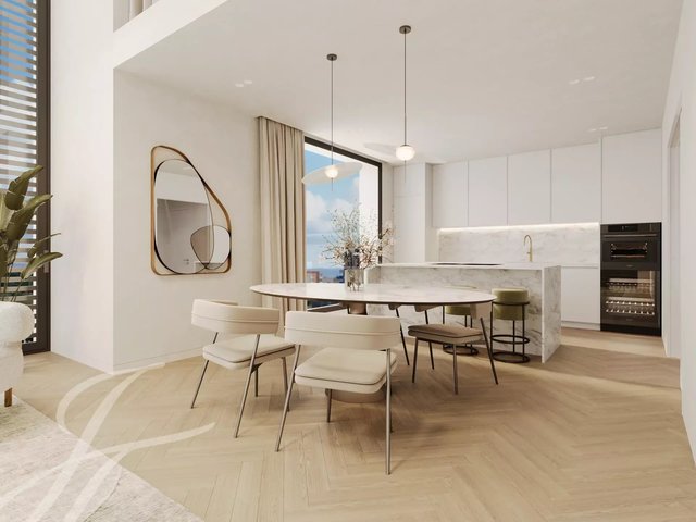 This 4th-floor penthouse offers a fully fitted open-plan kitchen, dining, and living area with 2 bedrooms and 2 bathrooms (1 ensuite). The interior staircase takes you to the magnificent 103sqm terrace offering ample space to create an exterior lounge, dining, and entertaining area. With a total built area of 270m² and an interior living space of 98 m², a comfortable and stylish atmosphere awaits you. There are three interior designs to choose from: Adagio, Arta & Raw.