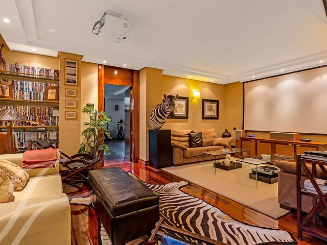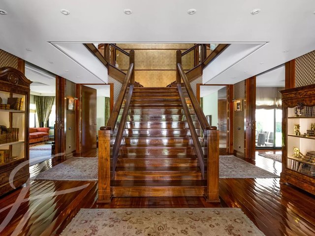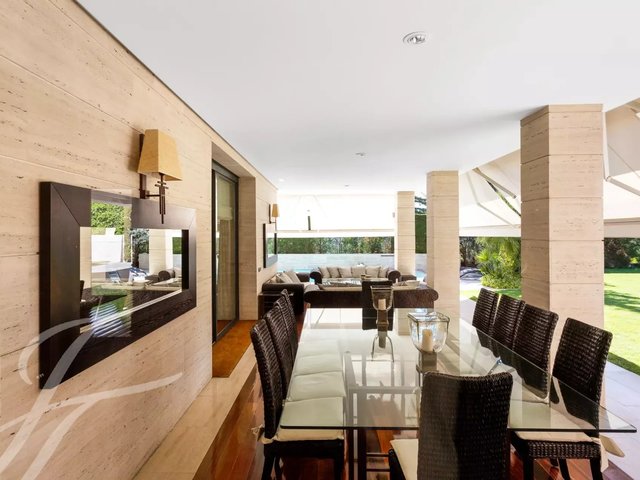In the basement, there are two service bedrooms with bathroom, closet, and a small service kitchen. Internal garage for five/four cars, utility room and storage room. At the other end of the basement there is a projection room and service toilet that continues with the indoor pool area, and gym, attached full bathroom and sauna.