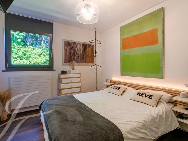 Spread over two levels, the ground floor comprises a vast 100 m² double living room with suspended fireplace, a fully equipped kitchen, a utility room, two bedrooms, a shower room and a guest toilet.