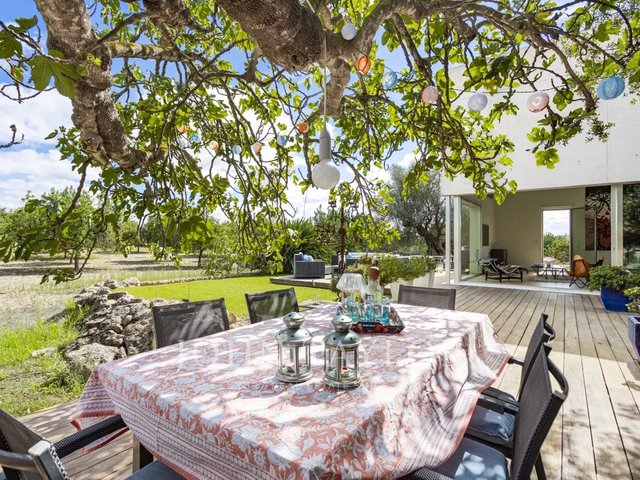 The estate comprises two independent residences. The main house, of modern architecture, stands out for its impressive floor-to-ceiling windows that flood every space with natural light and allow panoramic views of the Mallorcan countryside. It features two bedrooms, two bathrooms, and an extraordinary master suite located on the upper floor alongside an open-plan office with views to both sides of the villa.