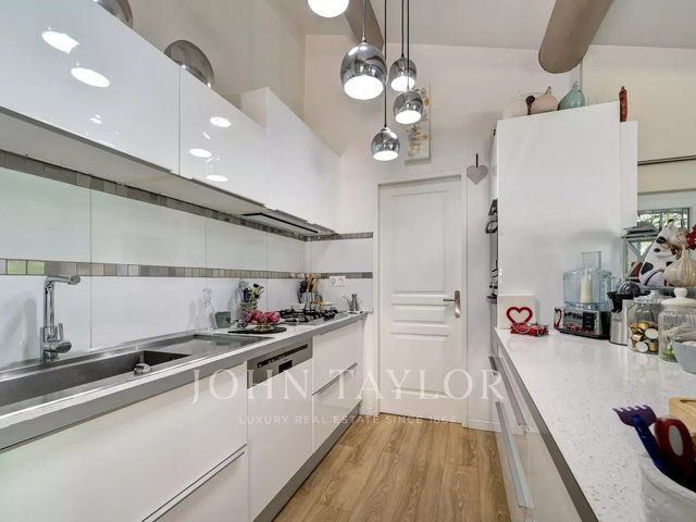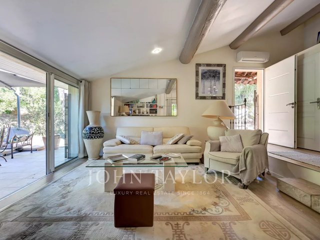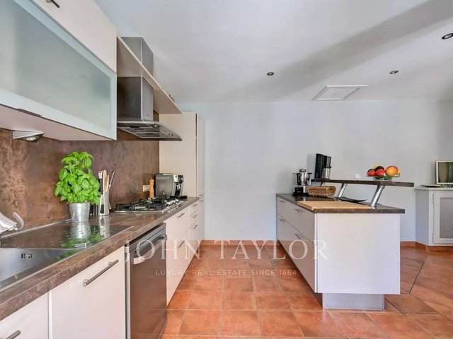 The main house features generous volumes. On the first floor, a vast, light-filled living room opens onto a south-facing terrace and landscaped garden. The fully-equipped kitchen, extended by a laundry room and storeroom, is accompanied by an office and a ground-level suite.