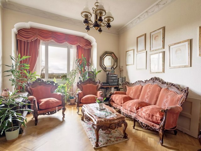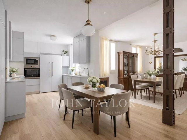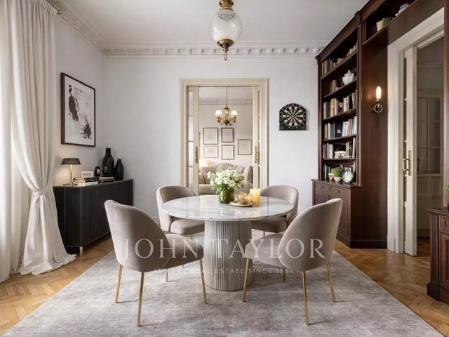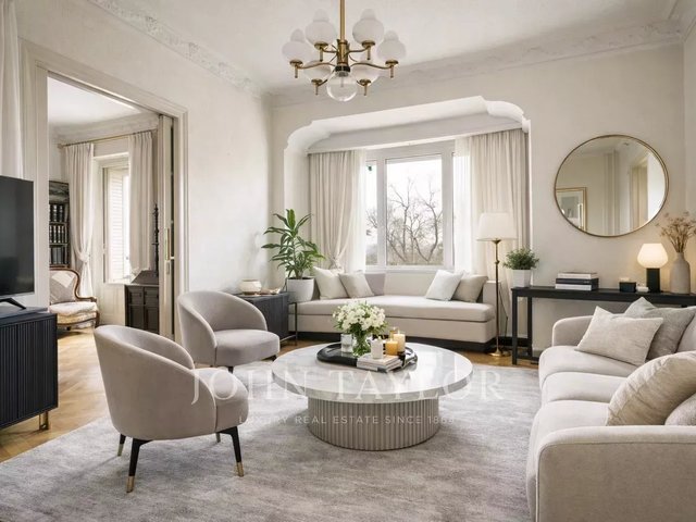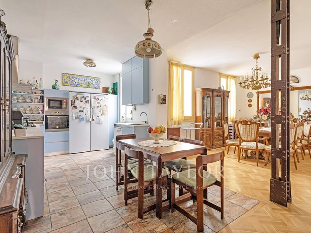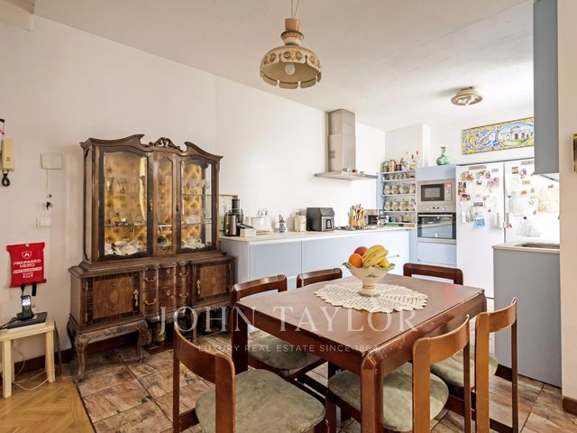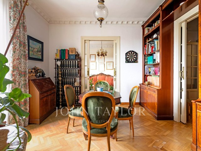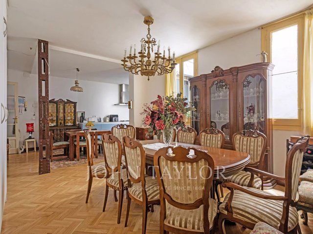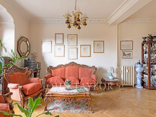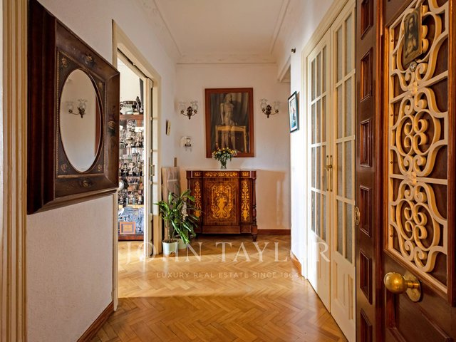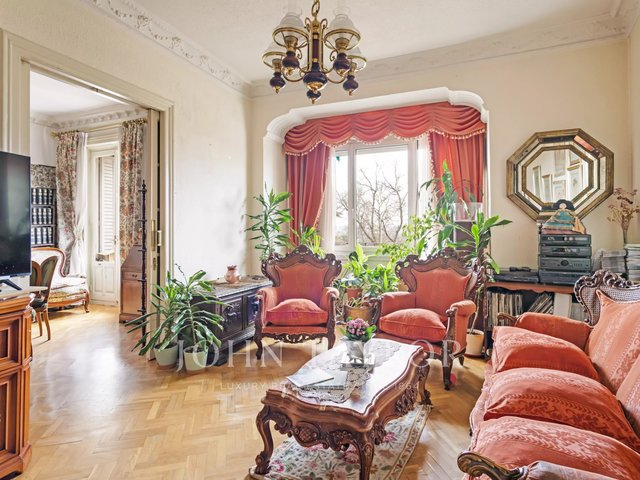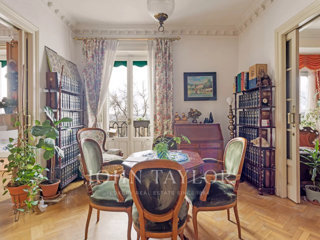 The house stands out for its stately character, with high ceilings, classic moldings and an architecture that evokes the elegance of an authentic palatial apartment. The living room, spacious and bathed in natural light, opens through imposing balconies with direct views of the park, a protected space that guarantees absolute privacy and unalterable views over time.