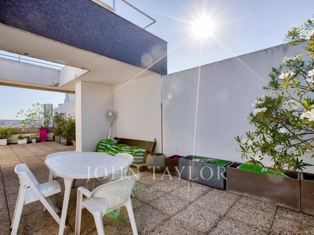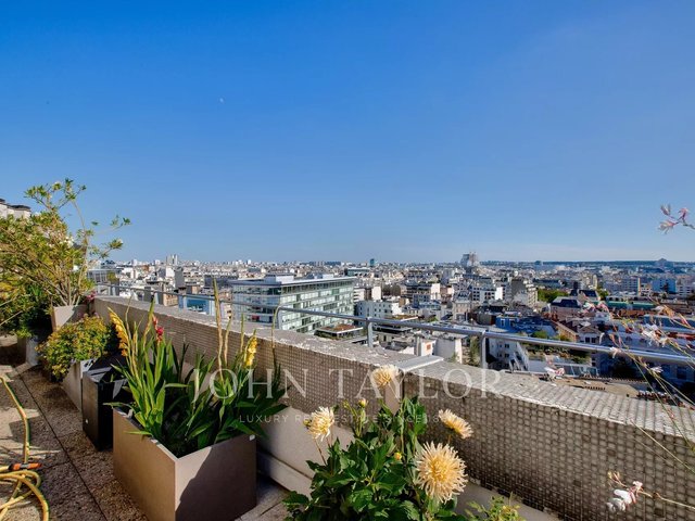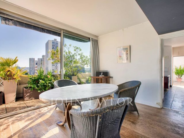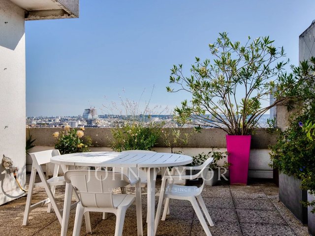 In a high-end 1970s residence with caretaker, we present an exceptional 118,48sqm (Carrez law) penthouse apartment on the 14th and top floor with elevator—entirely private on the floor and wrapped by a 120 sqm U-shaped terrace.