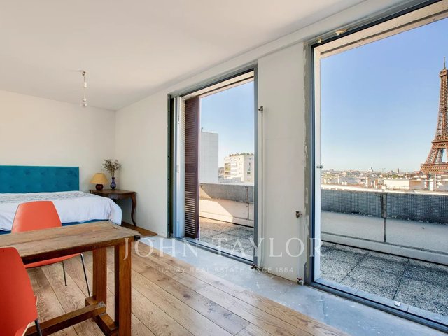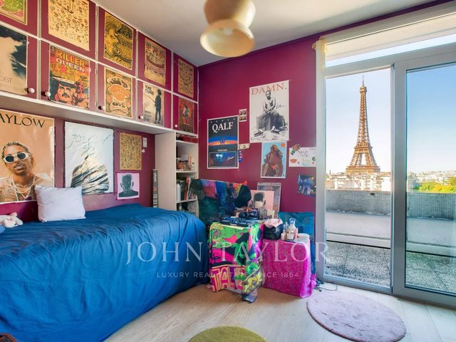 * A large bedroom with direct Eiffel Tower view and access to the northeast-facing terrace