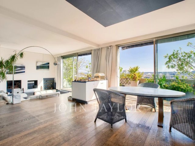 * A double living room with large bay windows opening onto the southwest-facing terrace